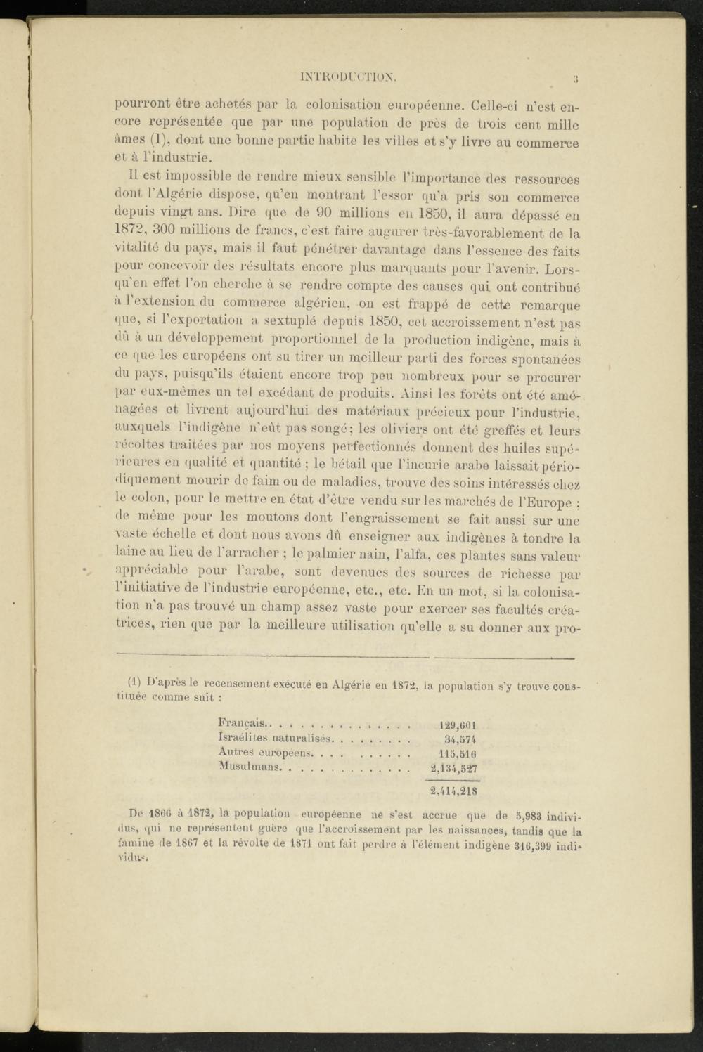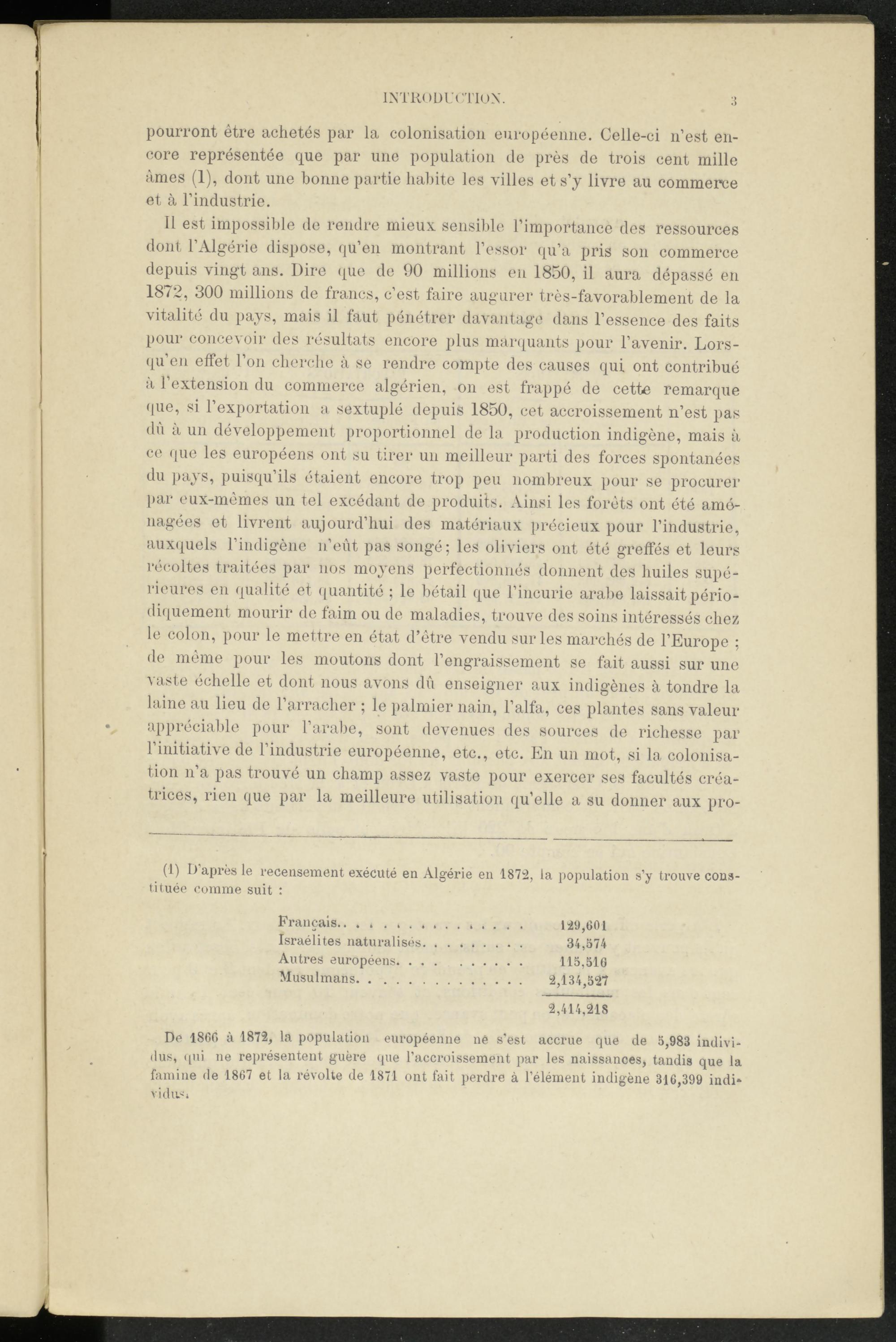 Il est impossible de rendre mieux sensible l’importance des ressources dont, l’Algérie dispose, qu’en montrant l’essor qu’a pris son commerce depuis vingt ans. Dire que de 90 millions en 1850, il aura dépassé en 1872, 300 millions de francs, c’est faire augurer très-favorablement de la vitalité du pays, mais il faut pénétrer davantage dans l’essence des faits pour concevoir des résultats encore plus marquants pour l’avenir. Lorsqu'on effet l’on cherche à se rendre compte des causes qui ont contribué à l’extension du commerce algérien, on est frappé de cette remarque que, si l’exportation a sextuplé depuis 1850, cet accroissement n’est pas dû à un développement proportionnel de la production indigène, mais à ce que les européens ont su tirer un meilleur parti des forces spontanées du pays, puisqu’ils étaient encore trop peu nombreux pour se procurer par eux-mêmes un tel excédant de produits. Ainsi les forêts ont été aménagées et livrent aujourd’hui des matériaux précieux pour l’industrie, auxquels l’indigène n’eut pas songé; les oliviers ont été greffés et leurs récoltes traitées par nos moyens perfectionnés donnent des huiles supérieures en qualité et quantité ; le bétail que l’incurie arabe laissait périodiquement mourir de faim ou de maladies, trouve des soins intéressés chez le colon, pour le mettre en état d’être vendu sur les marchés de l’Europe ; de même pour les moutons dont l’engraissement se fait aussi sur une vaste échelle et dont nous avons dû enseigner aux indigènes à tondre la laine au lieu de l’arracher ; le palmier nain, l’alfa, ces plantes sans valeur appréciable pour l’arabe, sont devenues des sources de richesse par l’initiative de l’industrie européenne, etc., etc. En un mot, si la colonisation n’a pas trouvé un champ assez vaste pour exercer ses facultés créatrices, rien que par la meilleure utilisation qu’elle a su donner aux pro-