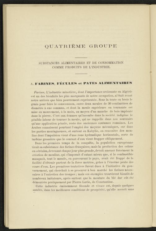 Dans les premiers temps de la conquête, la population européenne tirait sa subsistance des farines françaises; mais la production des colons en céréales, devenant chaque jour plus grande, devait amener forcément la création de moulins, qui s’imposait d’autant mieux que, si le combustible manquait, tout le monde, en parcourant le pays, avait été frappé de la facilité d’obtenir partout de la force motrice, grâce à l’énorme pente des cours d’eau. Les premières tentatives furent dues à l’initiative du gouvernement, qui cherchait à se procurer à bon marché les farines nécessaires à l’entretien des troupes ; mais ces exemples trouvèrent bientôt de nombreux imitateurs, après surtout que la mouture du blé dur eût été démontrée pratiquement par Pierre Lavie, de Constantine.