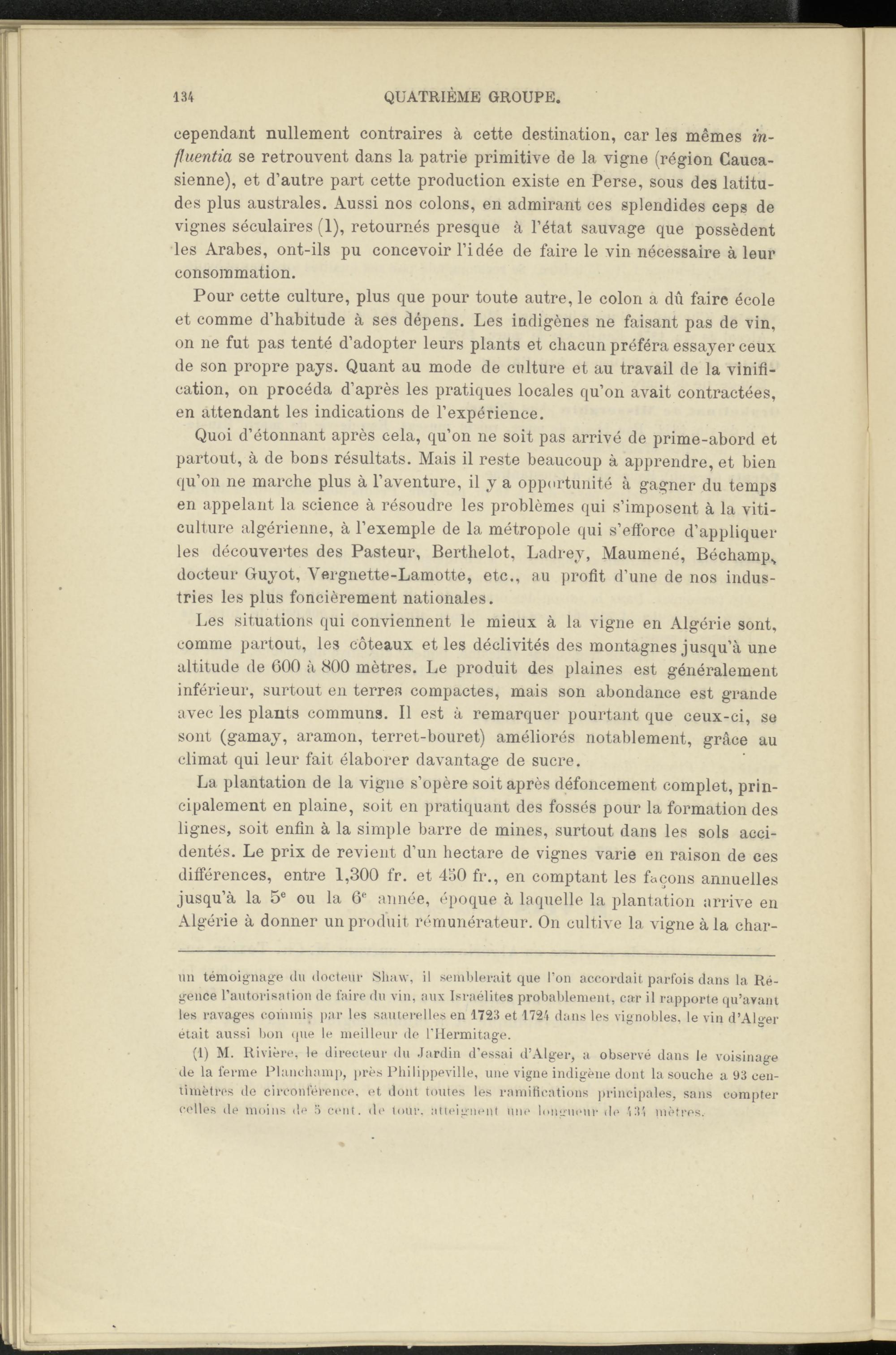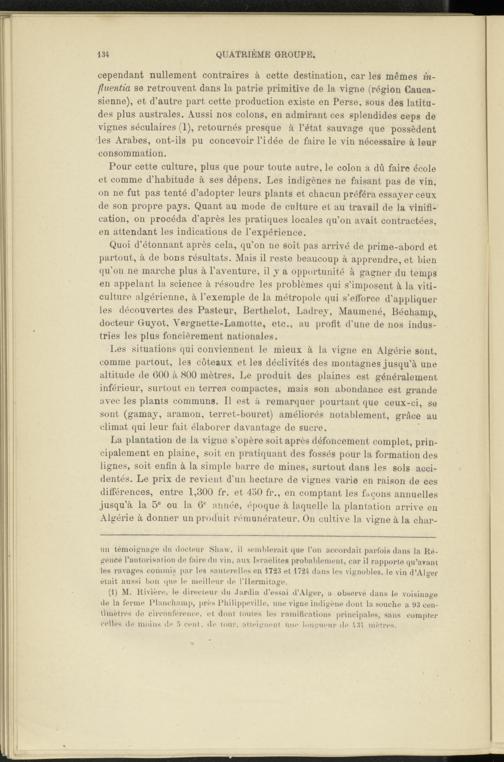 cependant nullement contraires à cette destination, car les mêmes m- fluentia se retrouvent dans la patrie primitive de la vigne (région Caucasienne), et d’autre part cette production existe en Perse, sous des latitudes plus australes. Aussi nos colons, en admirant ces splendides cepg de vignes séculaires (1), retournés presque à l’état sauvage que possèdent les Arabes, ont-ils pu concevoir l’idée de faire le vin nécessaire à leur consommation.