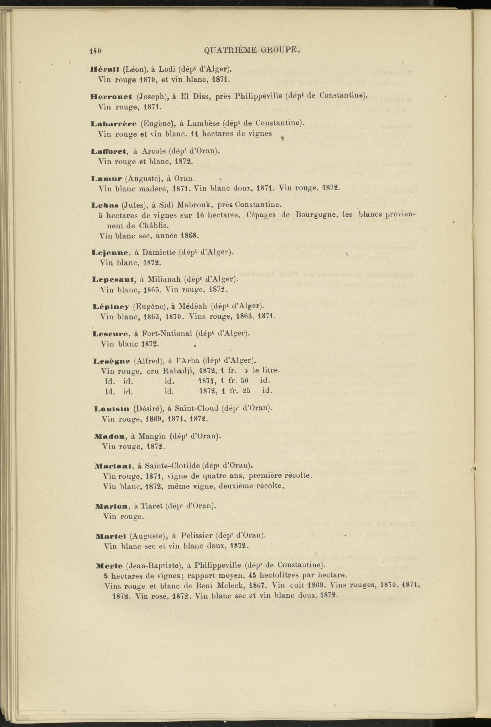 Vins rouge et blanc de Béni Meleck, 1867. Vin cuit 1869. Vins rouges, 1870, 1871, 1872. Vin rosé, 1872. Vin blanc sec et vin blanc doux. 1872.