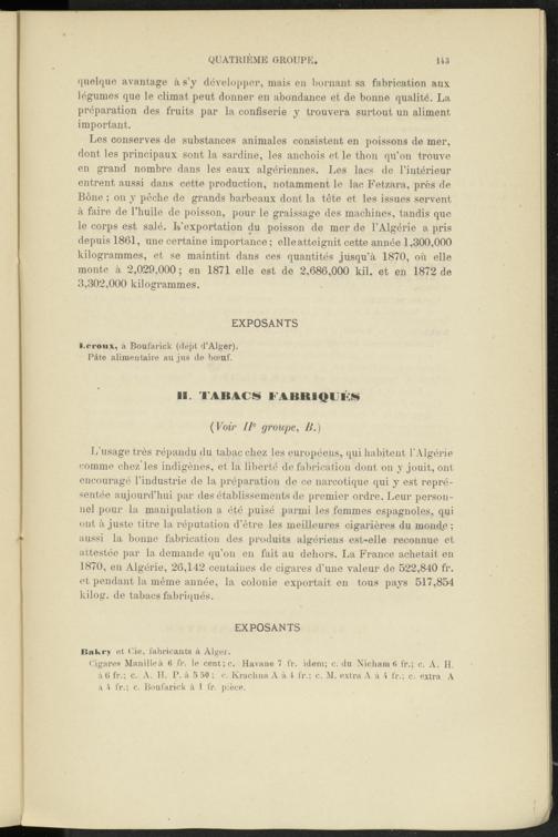 L’usage très répandu du tabac chez les européens, qui habitent l’Algérie comme chez'les indigènes, et la liberté de fabrication dont on y jouit, ont encouragé l’industrie de la préparation de ce narcotique qui y est représentée aujourd’hui par des établissements de premier ordre. Leur personnel pour la manipulation a été puisé parmi les femmes espagnoles, qui ont ajuste titre la réputation d’être les meilleures cigarières du monde; aussi la bonne fabrication des produits algériens est-elle reconnue et attestée par la demande qu’on en fait au dehors. La France achetait en 1870, en Algérie, 26,142 centaines de cigares d’une valeur de 522,840 fr. et pendant la même année, la colonie exportait en tous pays 517,854 kilog. de tabacs fabriqués.