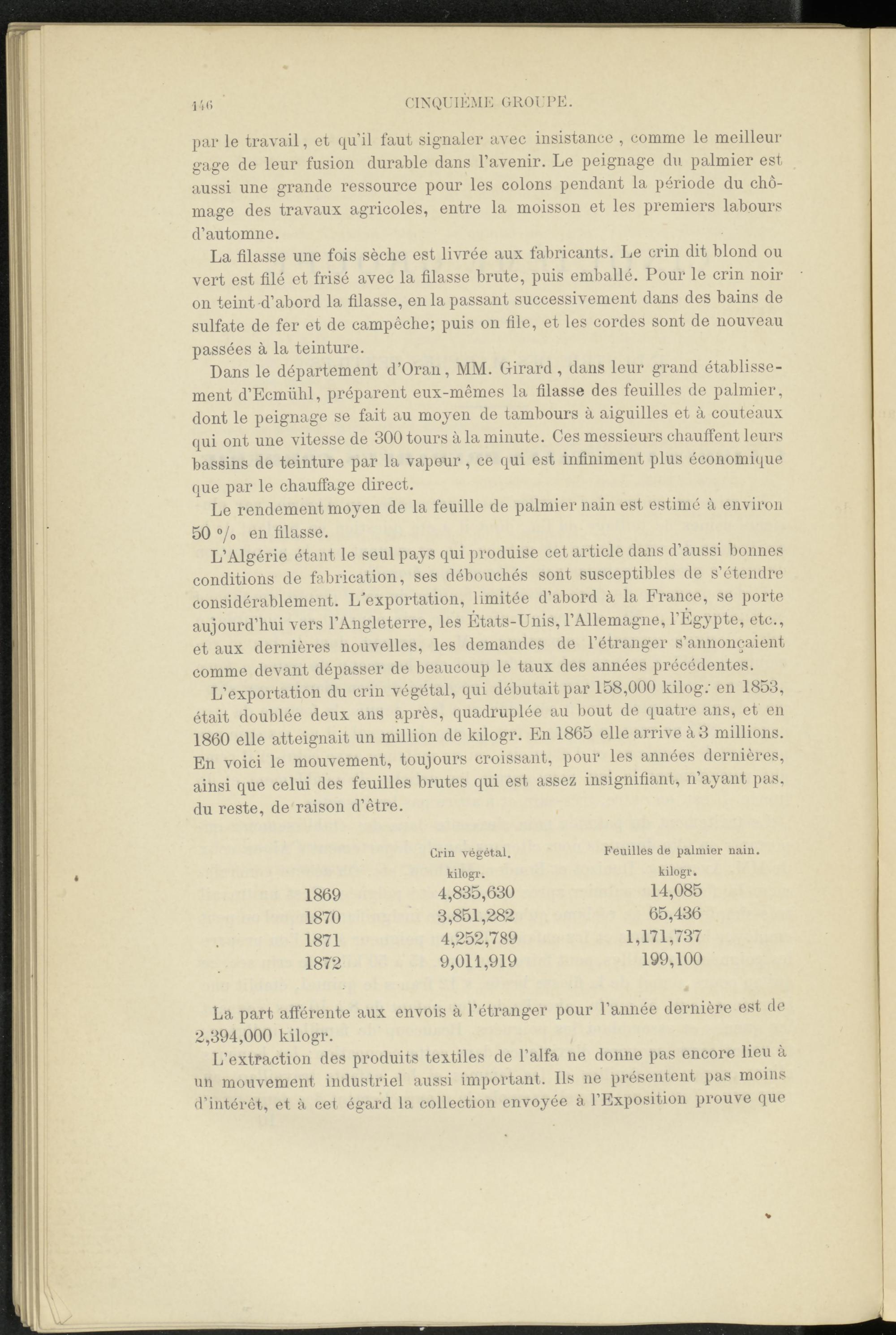 L’exportation du crin végétal, qui débutait par 158,000 kilog; en 1853, était doublée deux ans après, quadruplée au bout de quatre ans, et en 1860 elle atteignait un million de kilogr. En 1865 elle arrive à 3 millions. En voici le mouvement, toujours croissant, pour les années dernières, ainsi que celui des feuilles brutes qui est assez insignifiant, n’ayant pas. du reste, de raison d’être.