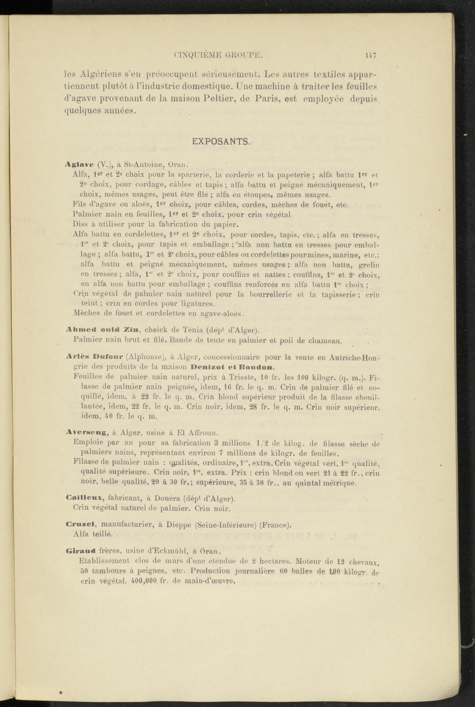 les Algériens s’en préoccupent sérieusement. Les autres textiles appartiennent plutôt à rindustrie domestique. Une machine à traiter les feuilles d’agave provenant de la maison Peltier, de Paris, est employée depuis quelques années.