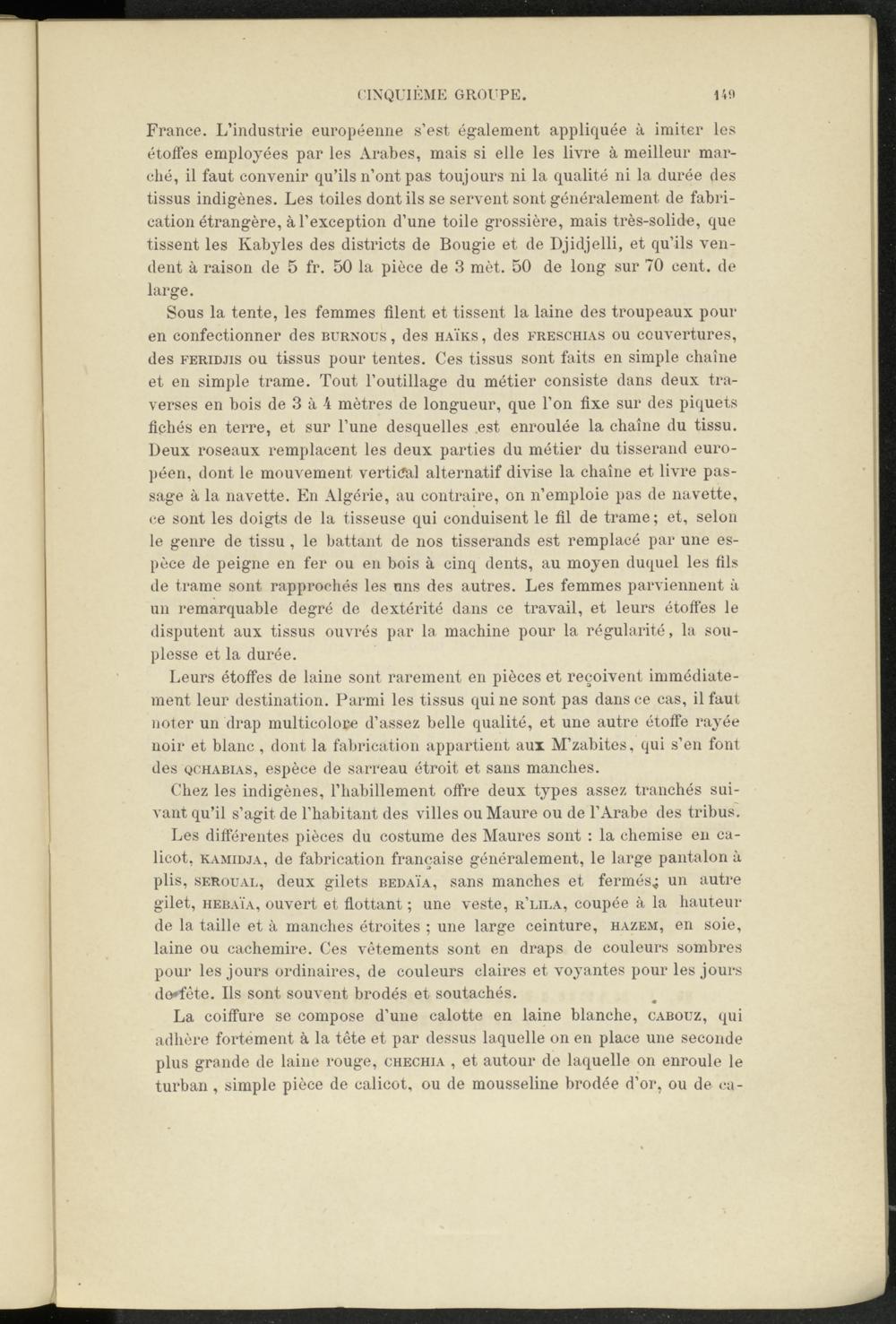 Leurs étoffes de laine sont rarement en pièces et reçoivent immédiatement leur destination. Parmi les tissus qui ne sont pas dans ce cas, il faut noter un drap multicolore d’assez belle qualité, et une autre étoffe rayée noir et blanc, dont la fabrication appartient aux M’zabites, qui s’en font des qchabias, espèce de sarreau étroit et sans manches.