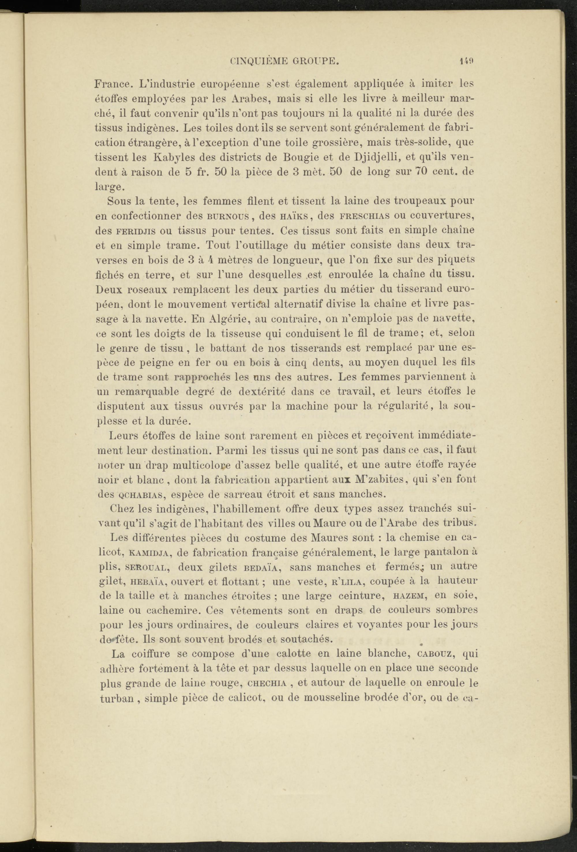 Sous la tente, les femmes filent et tissent la laine des troupeaux pour en confectionner des burnous , des haïks , des freschias ou couvertures, des feridjis ou tissus pour tentes. Ces tissus sont faits en simple chaîne et en simple trame. Tout l’outillage du métier consiste dans deux traverses en bois de 3 à 4 mètres de longueur, que l’on fixe sur des piquets fichés en terre, et sur l’une desquelles est enroulée la chaîne du tissu. Deux roseaux remplacent les deux parties du métier du tisserand européen, dont le mouvement vertical alternatif divise la chaîne et livre passage à la navette. En Algérie, au contraire, on n’emploie pas de navette, ce sont les doigts de la tisseuse qui conduisent le fil de trame ; et, selon le genre de tissu , le battant de nos tisserands est remplacé par une espèce de peigne en fer ou en bois à cinq dents, au moyen duquel les fils de trame sont rapprochés les uns des autres. Les femmes parviennent à un remarquable degré de dextérité dans ce travail, et leurs étoffes le disputent aux tissus ouvrés par la machine pour la régularité, la souplesse et la durée.