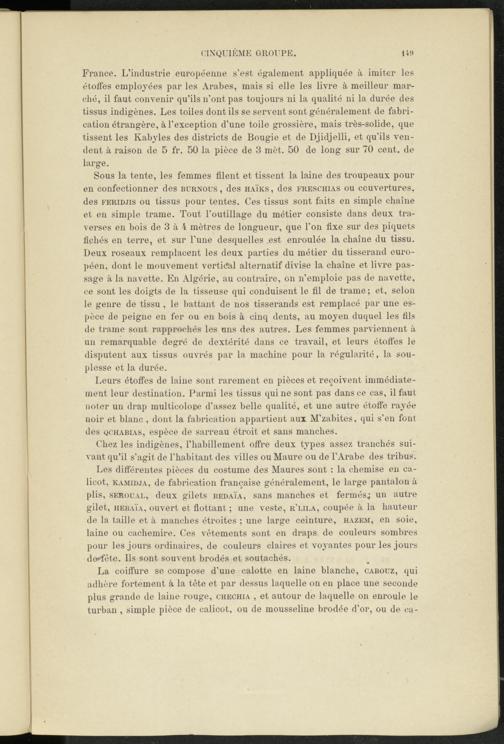 France. L’industrie européenne s’est également appliquée à imiter les étoffes employées par les Arabes, mais si elle les livre à meilleur marché, il faut convenir qu’ils n’ont pas toujours ni la qualité ni la durée des tissus indigènes. Les toiles dont ils se servent sont généralement de fabrication étrangère, à l’exception d’une toile grossière, mais très-solide, que tissent les Kabyles des districts de Bougie et de Djidjelli, et qu’ils vendent à raison de 5 fr. 50 la pièce de 3 mèt. 50 de long sur 70 cent, de large.