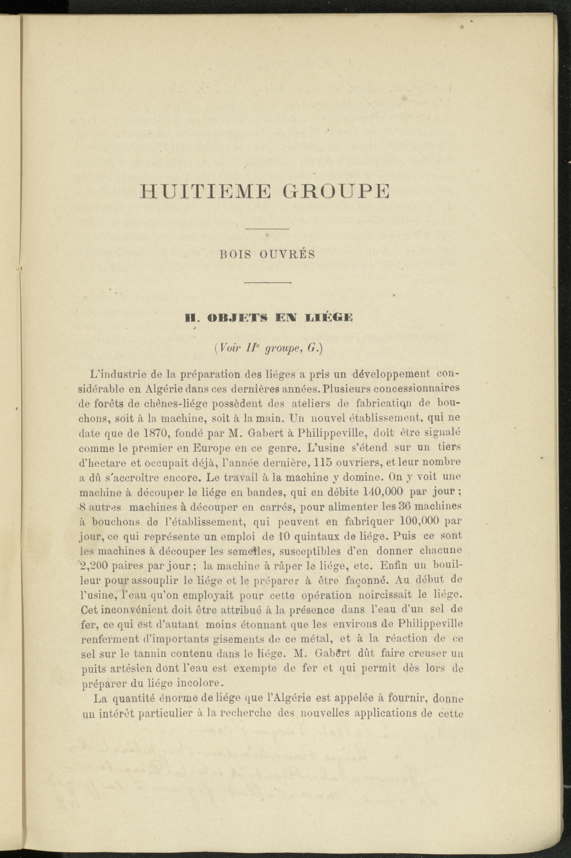 L’industrie de la préparation des lièges a pris un développement considérable en Algérie dans ces dernières années. Plusieurs concessionnaires de forêts de cliênes-liége possèdent des ateliers de fabrication de bouchons, soit à la machine, soit à la main. Un nouvel établissement, qui ne date que de 1870, fondé par M. Gabert à Philippeville, doit être signalé comme le premier en Europe en ce genre. L’usine s’étend sur un tiers d’hectare et occupait déjà, l’année dernière, 115 ouvriers, et leur nombre a dû s'accroître encore. Le travail à la machine y domine. On y voit une machine à découper le liège en bandes, qui en débite 140,000 par jour ; 8 autres machines à découper en carrés, pour alimenter les 36 machines à bouchons de l’établissement, qui peuvent en fabriquer 100,000 par jour, ce qui représente un emploi de 10 quintaux de liège. Puis ce sont les machines à découper les semelles, susceptibles d’en donner chacune ‘2,200 paires par jour ; la machine à râper le liège, etc. Enfin un bouilleur pour assouplir le liège et le préparer à être façonné. Au début de l’usine, l’eau qu’on employait pour cette opération noircissait le liège. Cet inconvénient doit être attribué à la présence dans l’eau d’un sel de fer, ce qui est d’autant moins étonnant que les environs de Philippeville renferment d’importants gisements de ce métal, et à la réaction de ce sel sur le tannin contenu dans le liège. M. GabSrt dût faire creuser un puits artésien dont l’eau est exempte de fer et qui permit dès lors de préparer du liège incolore.