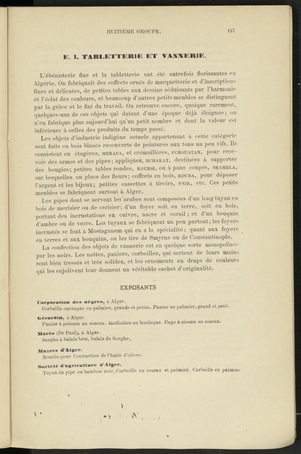 L’ébénisterie fine et la tabletterie ont été autrefois florissantes en Algérie. On fabriquait des coffrets ornés de marquetterie et d’inscriptions fines et délicates, de petites tables aux dessins séduisants par l'harmonie et l’éclat des couleurs, et beaucoup d’autres petits meubles se distinguant par la grâce et le fini du travail. On retrouve encore, quoique rarement, quelques-uns de ces objets qui datent d’une époque déjà éloignée; on n’en fabrique plus aujourd’hui qu’un petit nombre et dont la valeur est inférieure à celles des produits du temps passé.