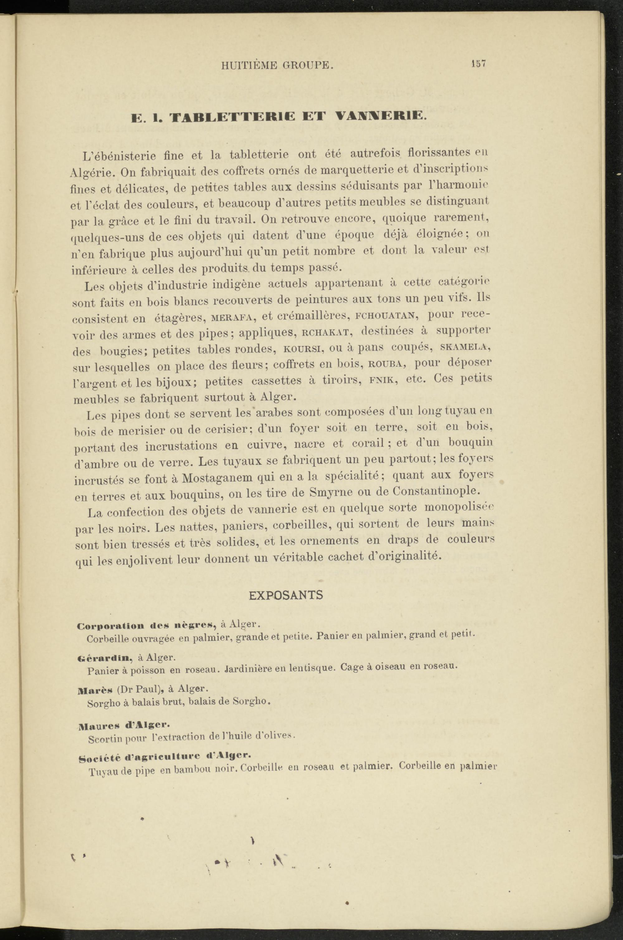 Les pipes dont se servent les'arabes sont composées d’un long tuyau en bois de merisier ou de cerisier; d’un foyer soit en terre, soit en bois, portant des incrustations en cuivre, nacre et corail ; et d’un bouquin d’ambre ou de verre. Les tuyaux se fabriquent un peu partout; les foyers incrustés se font à Mostaganem qui en a la spécialité ; quant aux foyers en terres et aux bouquins, on les tire de Smyrne ou de Constantinople.