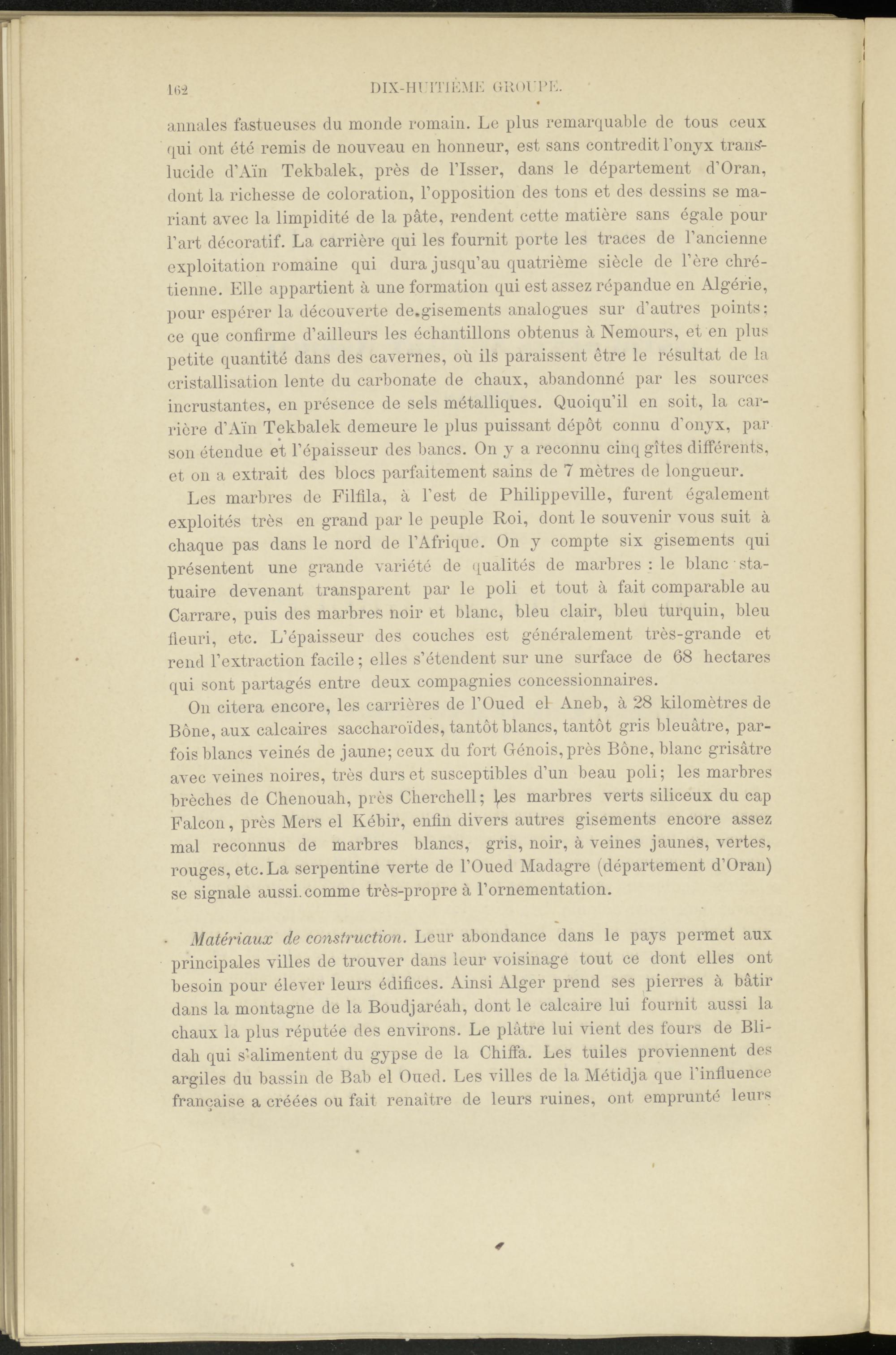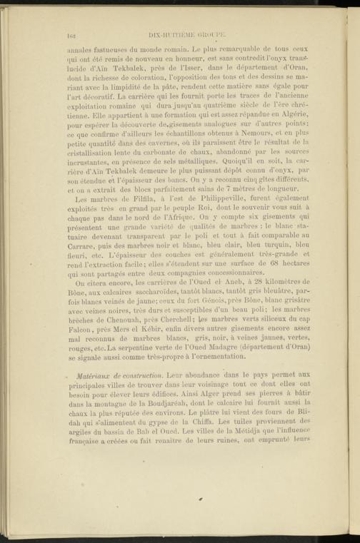 On citera encore, les carrières de l’Oued el Aneb, à 28 kilomètres de Bône, aux calcaires saccharoïdes, tantôt blancs, tantôt gris bleuâtre, parfois blancs veinés de jaune; ceux du fort Génois, près Bône, blanc grisâtre avec veines noires, très durs et susceptibles d’un beau poli; les marbres brèches de Chenouah, près Cherchell; ^es marbres verts siliceux du cap Falcon, près Mers el Kébir, enfin divers autres gisements encore assez mal reconnus de marbres blancs, gris, noir, à veines jaunes, vertes, rouges, etc. La serpentine verte de l’Oued Madagre (département d’Oran) se signale aussi, comme très-propre à l’ornementation.