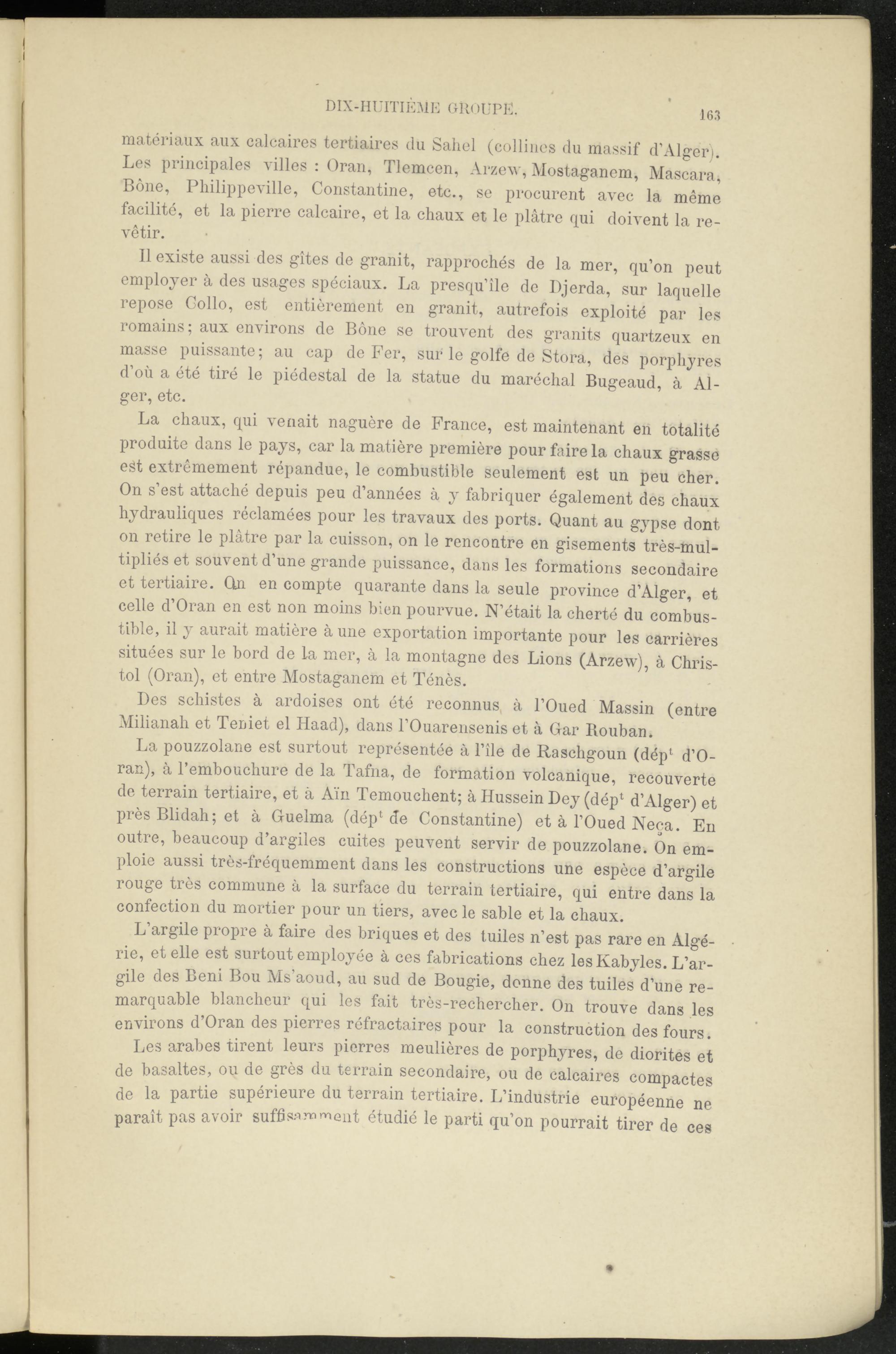 matériaux aux calcaires tertiaires du Sahel (collines du massif d’Alger'). Les principales villes : Oran, Tlemcen, Arzew, Mostaganem, Mascara, Bône, Philippeville, Constantine, etc., se procurent avec la même facilité, et la pierre calcaire, et la chaux et le plâtre qui doivent la revêtir.