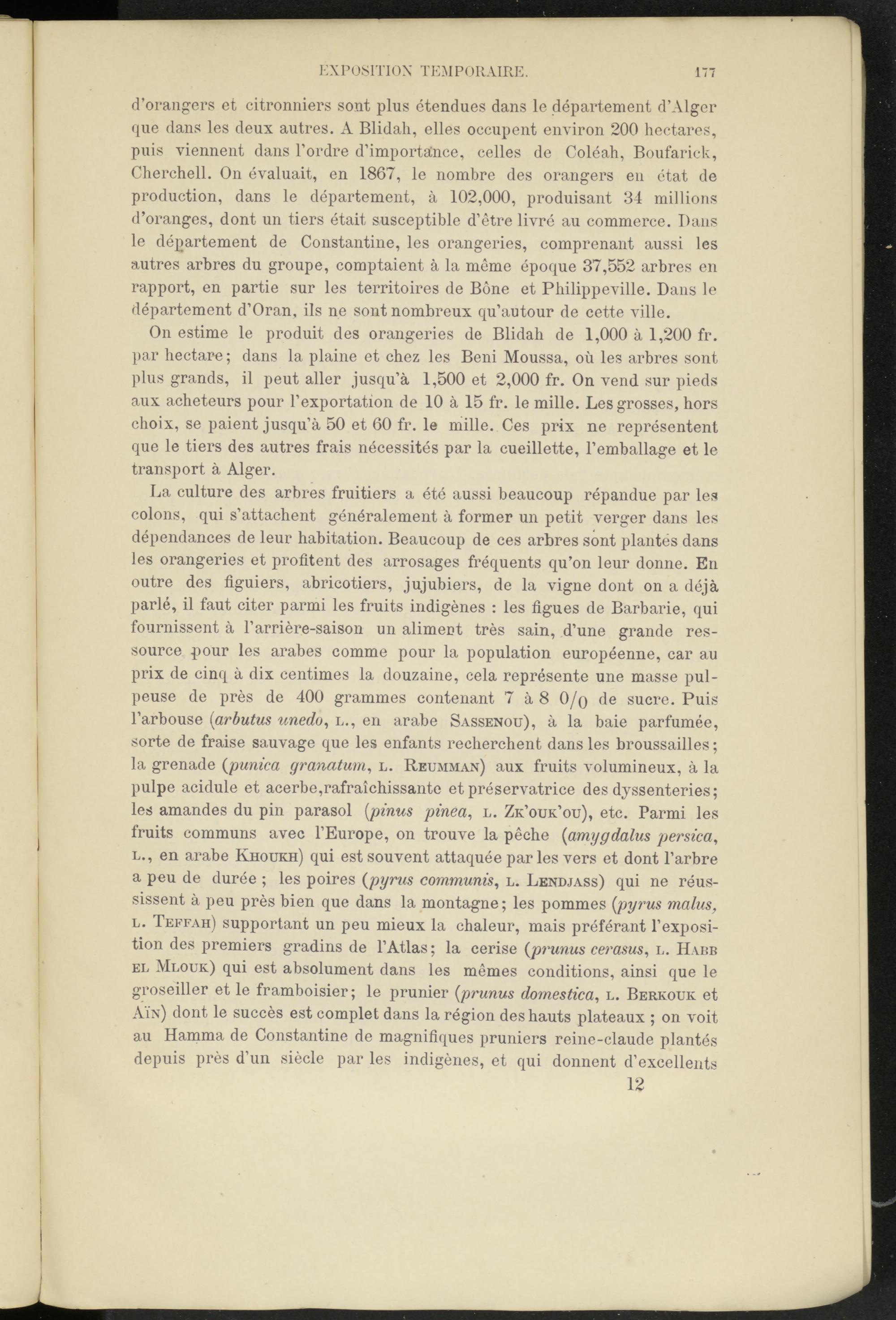 La culture des arbres fruitiers a été aussi beaucoup répandue par les colons, qui s’attachent généralement à former un petit verger dans les dépendances de leur habitation. Beaucoup de ces arbres sont plantés dans les orangeries et profitent des arrosages fréquents qu’on leur donne. En outre des figuiers, abricotiers, jujubiers, de la vigne dont on a déjà parlé, il faut citer parmi les fruits indigènes : les figues de Barbarie, qui fournissent à l’arrière-saison un aliment très sain, d’une grande ressource pour les arabes comme pour la population européenne, car au prix de cinq à dix centimes la douzaine, cela représente une masse pulpeuse de près de 400 grammes contenant 7 à 8 0/o de sucre. Puis l’arbouse ( arbutus unedo, l., en arabe Sassenou), à la baie parfumée, sorte de fraise sauvage que les enfants recherchent dans les broussailles ; la grenade ( punica granatum , l. Reumman) aux fruits volumineux, à la pulpe acidulé et acerbe,rafraîchissante et préservatrice des dyssenteries; les amandes du pin parasol ( pinus pinea , l. Zk’ouk’ou), etc. Parmi les fruits communs avec l’Europe, on trouve la pêche {amygdalus persica, l., en arabe Khoukh) qui est souvent attaquée par les vers et dont l’arbre a peu de durée ; les poires ( pyrus communis , l. Lendjass) qui ne réussissent à peu près bien que dans la montagne ; les pommes {pyrus malus , l. Teffah) supportant un peu mieux la chaleur, mais préférant l’exposition des premiers gradins de l’Atlas ; la cerise {prunus cerasus , L. H um el Mlouk) qui est absolument dans les mêmes conditions, ainsi que le groseiller et le framboisier; le prunier {prunus domestica , l. Berkouic et Aïn) dont le succès est complet dans la région des hauts plateaux ; on voit au Hamma de Constantine de magnifiques pruniers reine-claude plantés depuis près d’un siècle par les indigènes, et qui donnent d’excellents