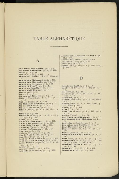 Arbi (El) IVaït Mohamed, gr. 21, p. 169. Arbi (El) ould el Hadji, gr. 2, p. 98. Arles Dufour (Alphonse), gr. 2, p. 46;