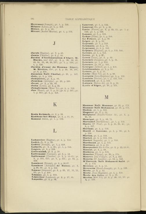 Maures (les) d’Alger, gr. 8, p. 157. Maurin (D r Amédée), gr. 12, p. 160. M’Barreck Naît Mohamed Saïd, gr. 21, p. 172.