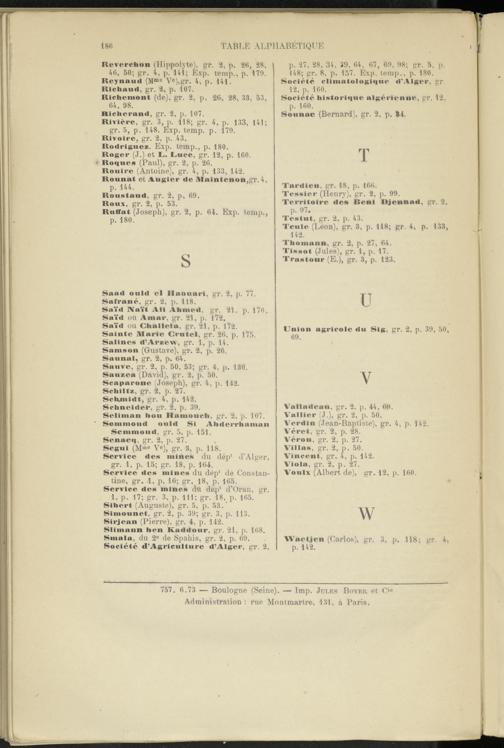 Slimann hen Kaddour, gr. 21, p. 168. Smala, du 2 e de Spahis, gr. 2, p. 69. Société d’Agricultui'e d’Alger, gr. 2,