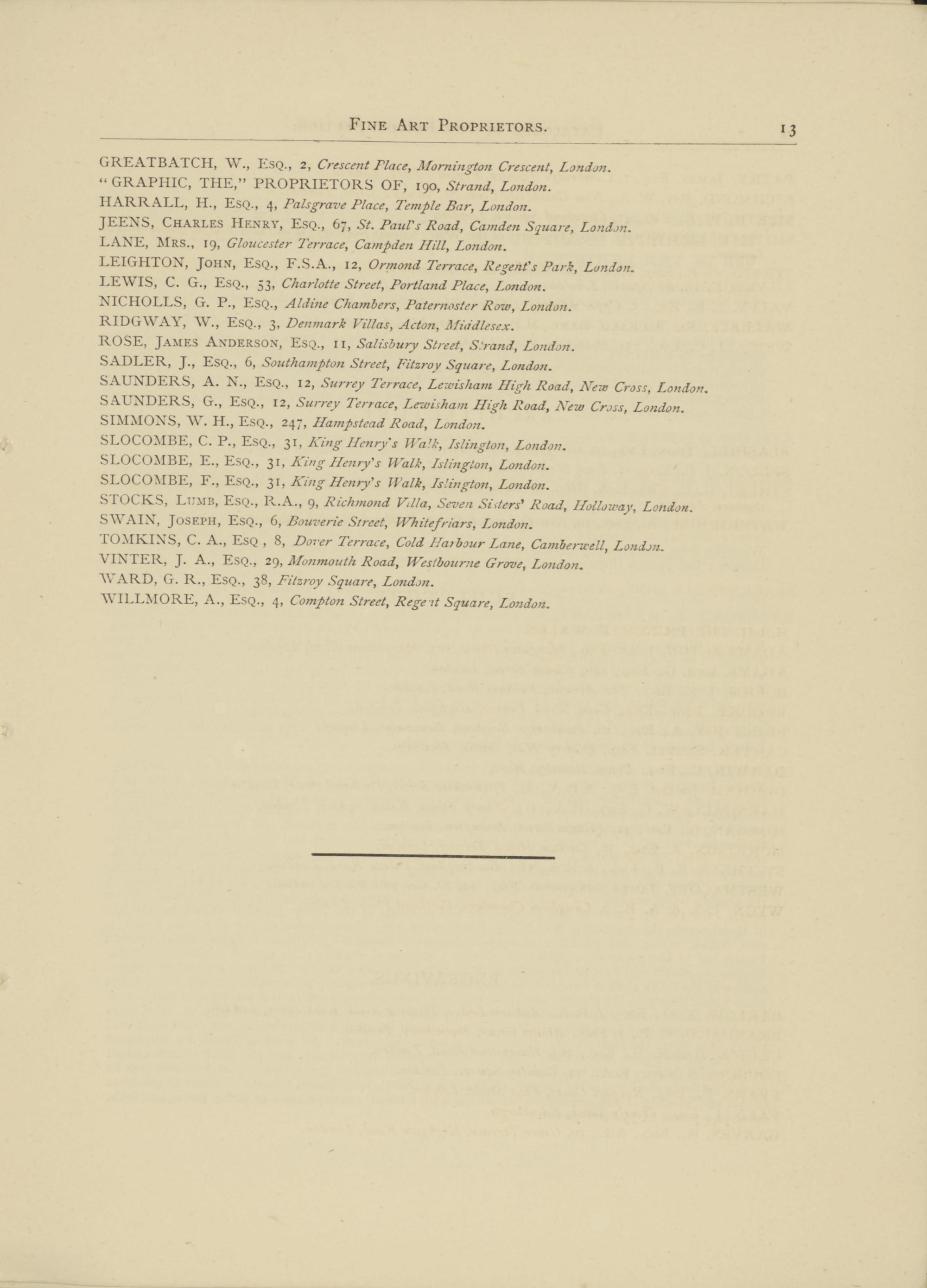 STOCKS, Ltjmb, Esq., R.A., 9, Richmond Villa, Seven Sitters’ Road, Holloway, London. SWAIN, Joseph, Esq., 6, Bouverie Street, Whitefriars, London .