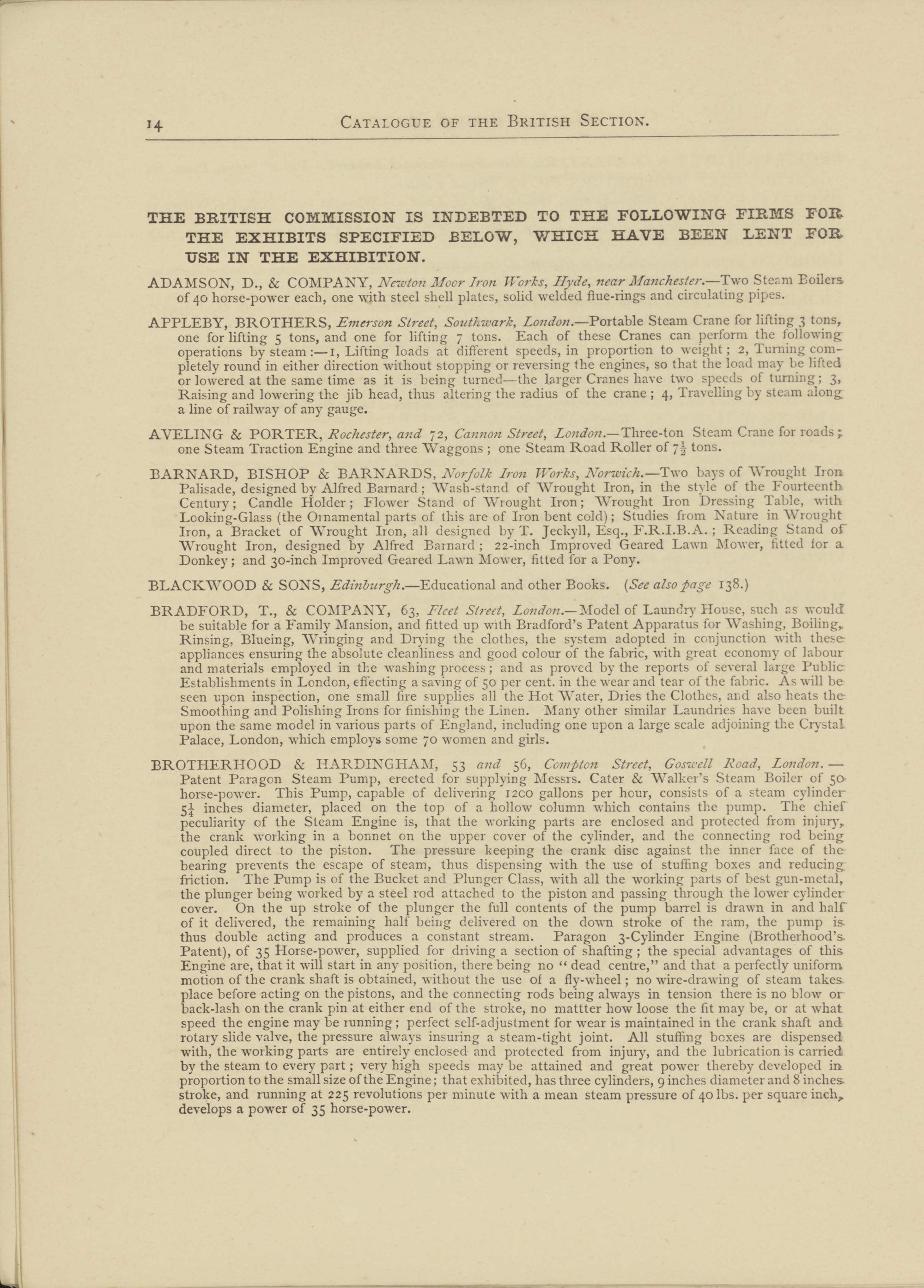 THE BRITISH COMMISSION IS INDEBTED TO THE FOLLOWING FIRMS FOR THE EXHIBITS SPECIFIED BELOW, WHICH HAVE BEEN LENT FOR USE IN THE EXHIBITION.