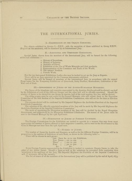 The Jurors of the kingdoms and countries represented in the Austrian Reichsrath will be elected, one half by the Exhibitors of each of the different Groups, and the other half will be officially appointed. Should the number of Jurors to be elected for one Group be uneven, half of the total number, less one, will be elected.