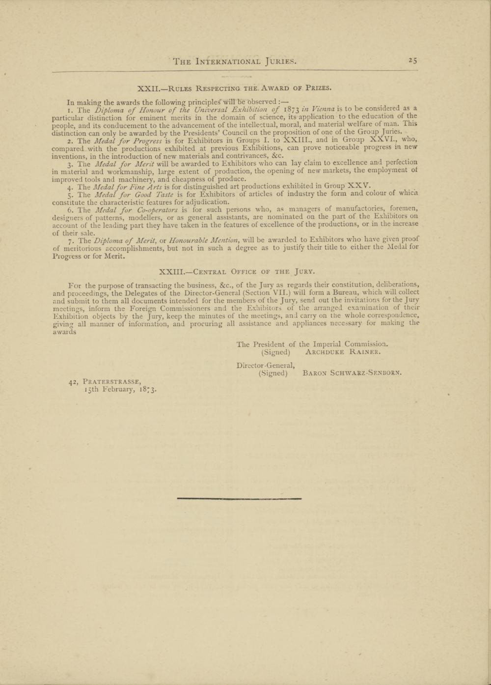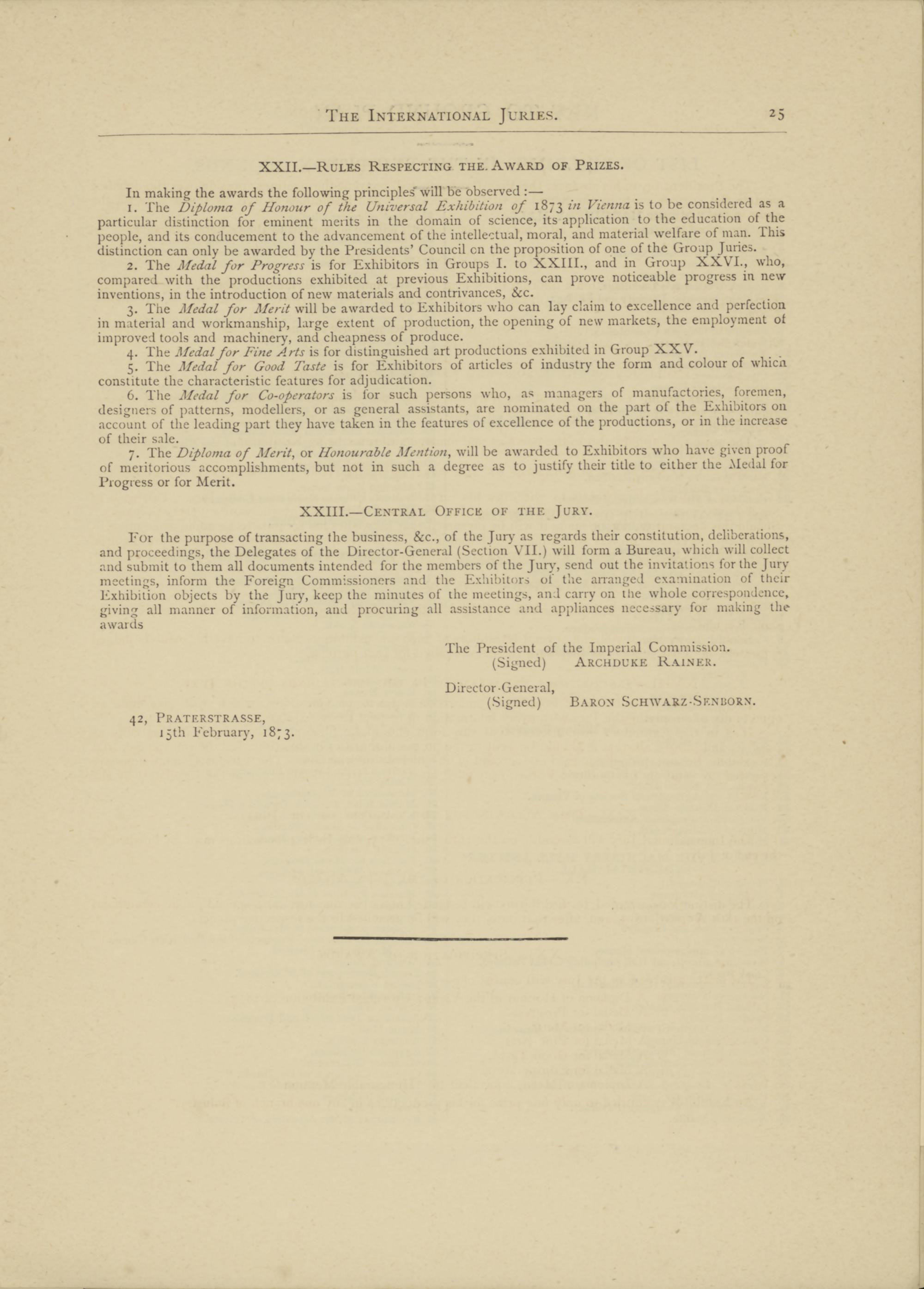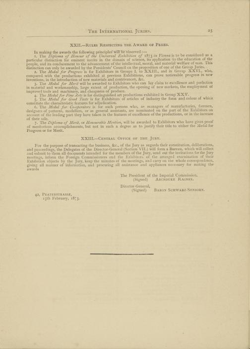 1. The Diploma of Honour of the Universal Exhibition of 187 $ in Vienna is to be considered as a particular distinction for eminent merits in the domain of science, its application to the education of the people, and its conducement to the advancement of the intellectual, moral, and material welfare of man. This distinction can only be awarded by the Presidents’ Council cn the proposition of one of the Group Juries.