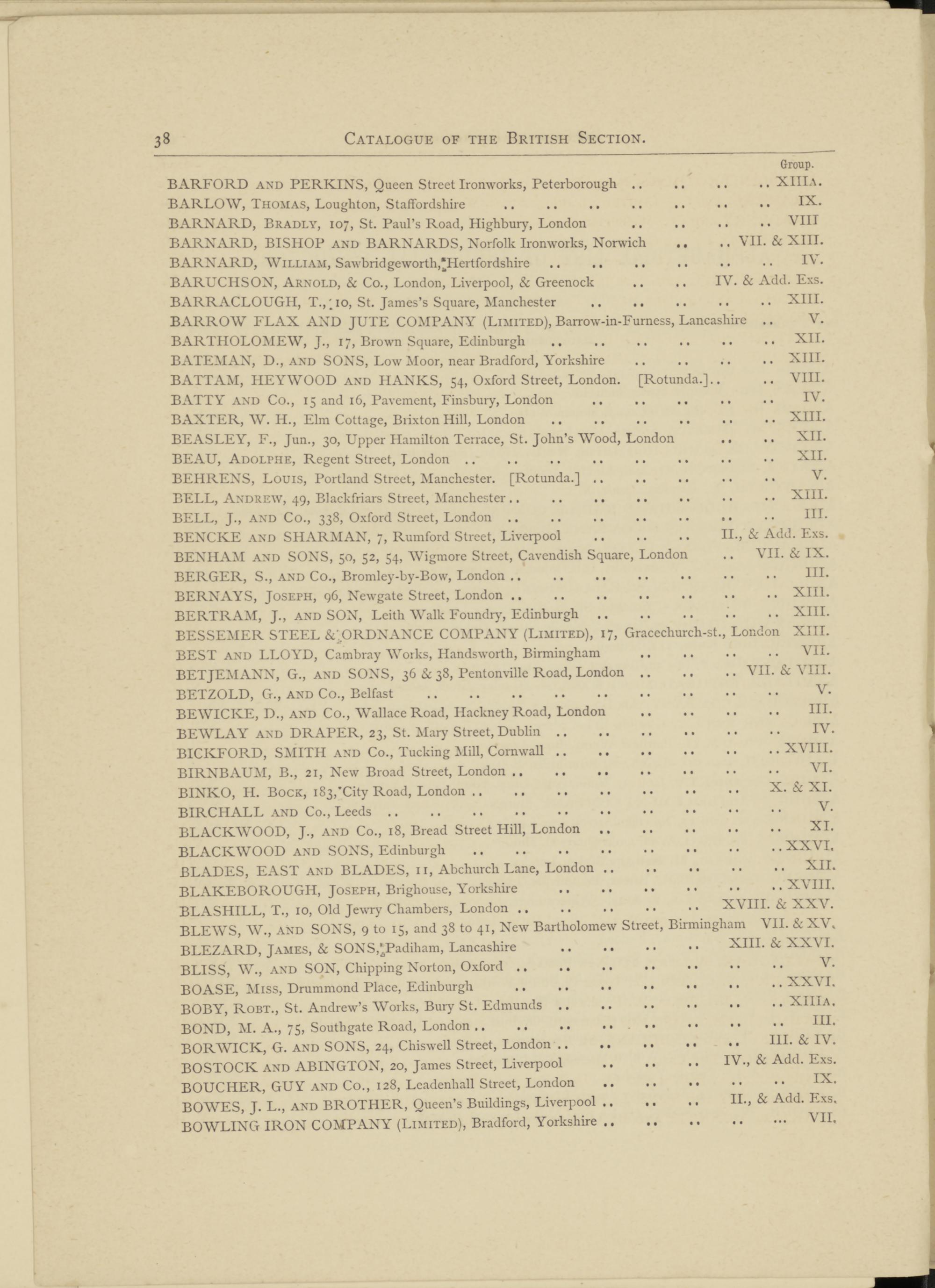 BARROW FLAX AND JUTE COMPANY (Limited), Barrow-in-Furness, Lancashire BARTHOLOMEW, J., 17, Brown Square, Edinburgh BATEMAN, D., and SONS, Low Moor, near Bradford, Yorkshire BATTAM, HEY WOOD and HANKS, 54, Oxford Street, London. [Rotunda.]..