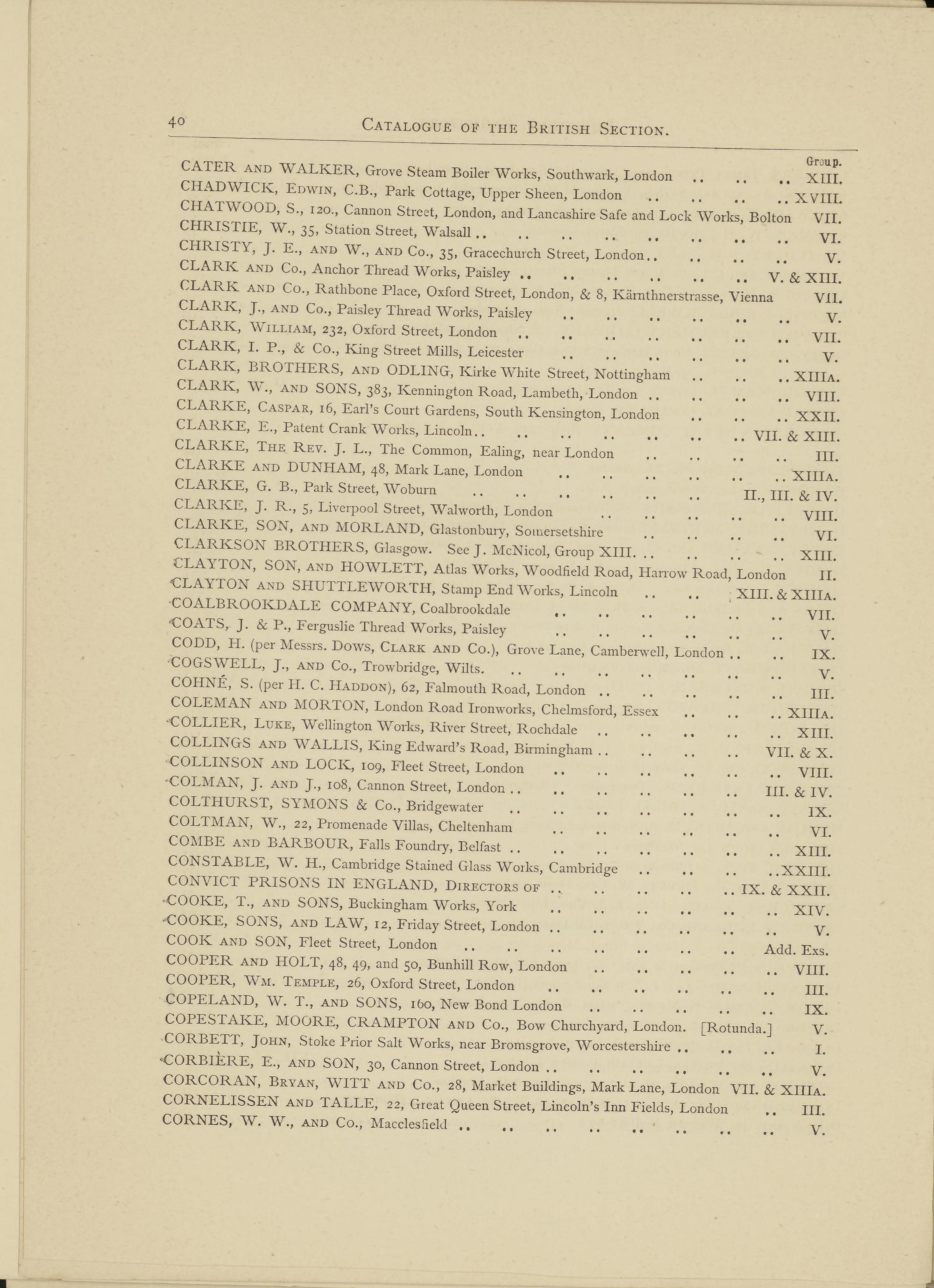 CORCORAN, Bryan, WITT and Co., 28, Market Buildings, Mark Lane, London VII. Sc XIIIa. CORNELISSEN and TALLE, 22, Great Queen Street, Lincoln’s Inn Fields, London .. III. CORNES, W. W., and Co., Macclesfield. 4 . V.