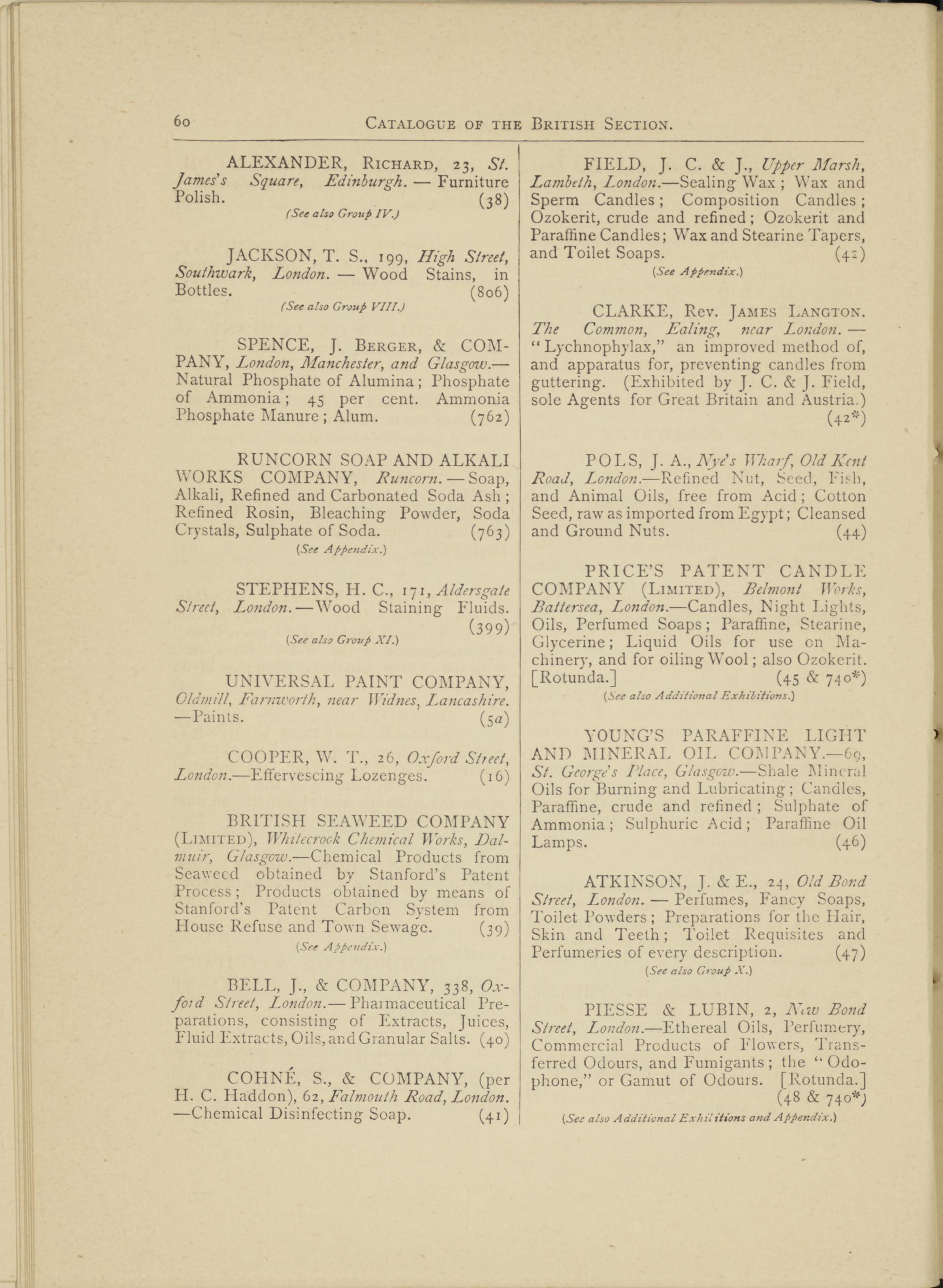 FIELD, J. C. & J., Upper Marsh, Lambeth, London. —Sealing Wax ; Wax and Sperm Candles; Composition Candles; Ozokerit, crude and refined; Ozokerit and Paraffine Candles; Wax and Stearine Tapers, and Toilet Soaps. (42)
