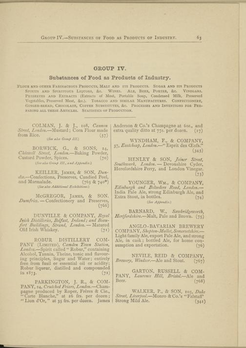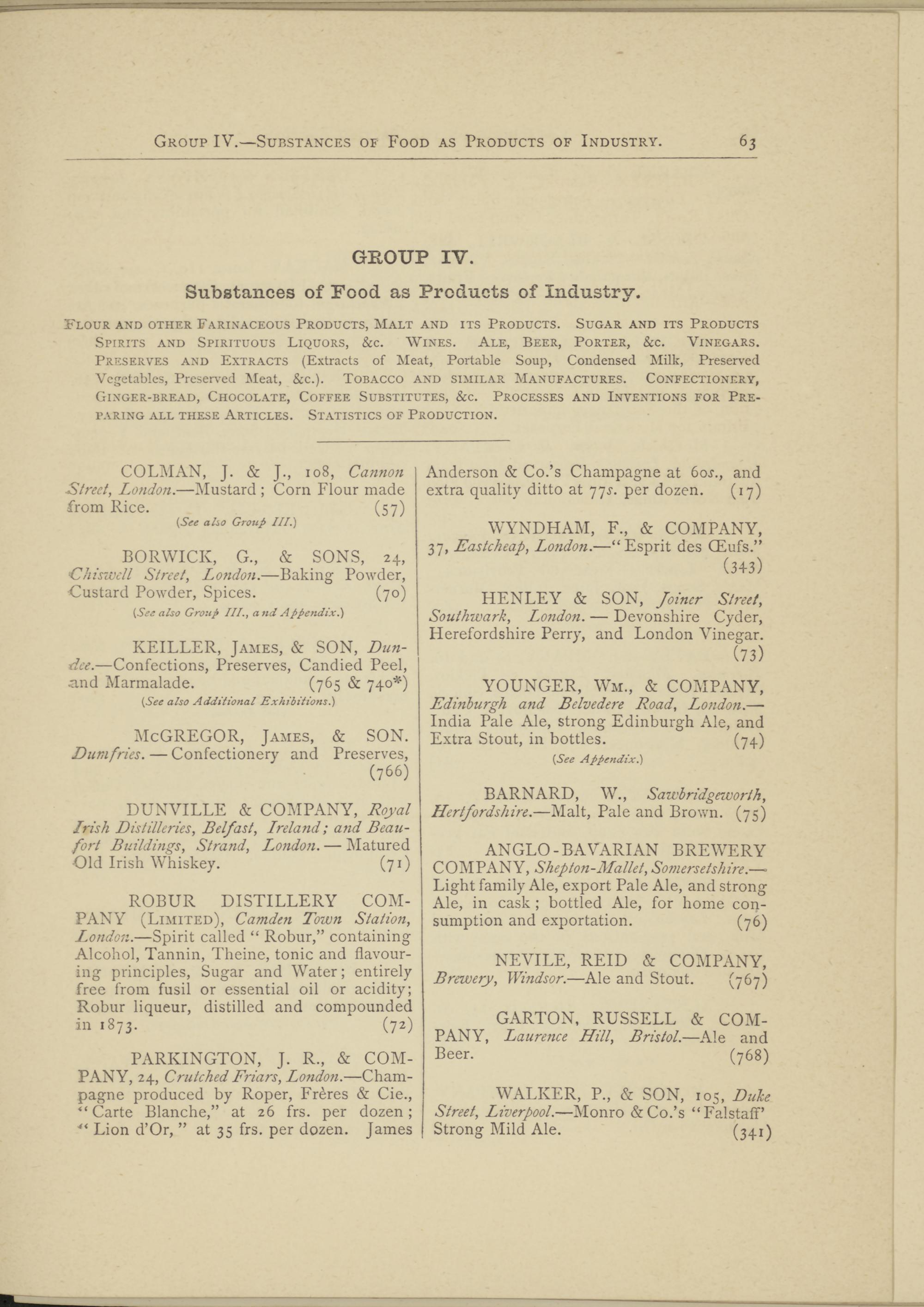Flour and other Farinaceous Products, Malt and its Products. Sugar and its Products Spirits and Spirituous Liquors, &c. Wines. Ale, Beer, Porter, See . Vinegars. Preserves and Extracts (Extracts of Meat, Portable Soup, Condensed Milk, Preserved Vegetables, Preserved Meat, &c.). Tobacco and similar Manufactures. Confectionery, Ginger-bread, Chocolate, Coffee Substitutes, &c. Processes and Inventions for Preparing all these Articles. Statistics of Production.