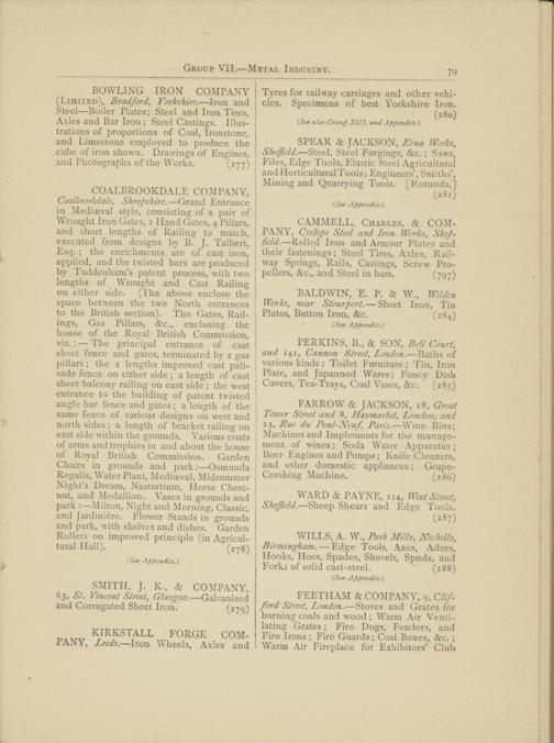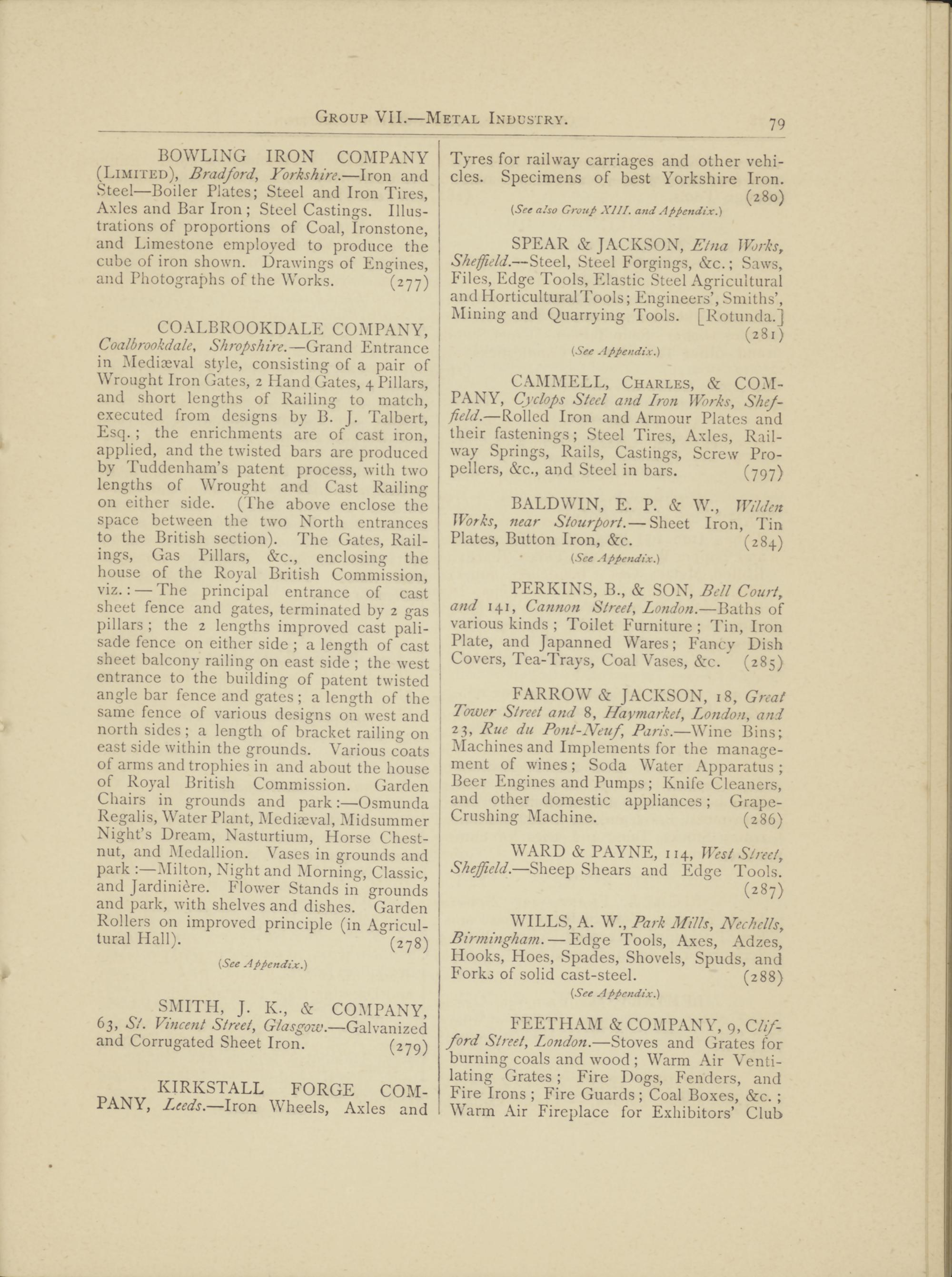 COALBROOKDALE COMPANY, j Coalbrookdale , Shropshire. —Grand Entrance j in Mediaeval style, consisting of a pair of Wrought Iron Gates, 2 Hand Gates, 4 Pillars, and short lengths of Railing to match, executed from designs by B. J. Talbert, Esq. ; the enrichments are of cast iron, applied, and the twisted bars are produced by Tuddenham’s patent process, with two lengths of Wrought and Cast Railing on either side. ( The above enclose the space between the two North entrances to the British section). The Gates, Railings, Gas Pillars, &c., enclosing the house of the Royal British Commission, viz.: — The principal entrance of cast sheet fence and gates, terminated by 2 gas pillars ; the 2 lengths improved cast palisade fence on either side ; a length of cast sheet balcony railing on east side ; the west entrance to the building of patent twisted angle bar fence and gates; a length of the same fence of various designs on west and north sides; a length of bracket railing on east side within the grounds. Various coats of arms and trophies in and about the house of Royal British Commission. Garden Chairs in grounds and park:—Osmunda Regalis, Water Plant, Mediaeval, Midsummer Night’s Dream, Nasturtium, Horse Chestnut, and Medallion. Vases in grounds and park :—Milton, Night and Morning, Classic, and Jardiniere. Flower Stands in grounds and park, with shelves and dishes. Garden Rollers on improved principle (in Agricultural Hall). (278)