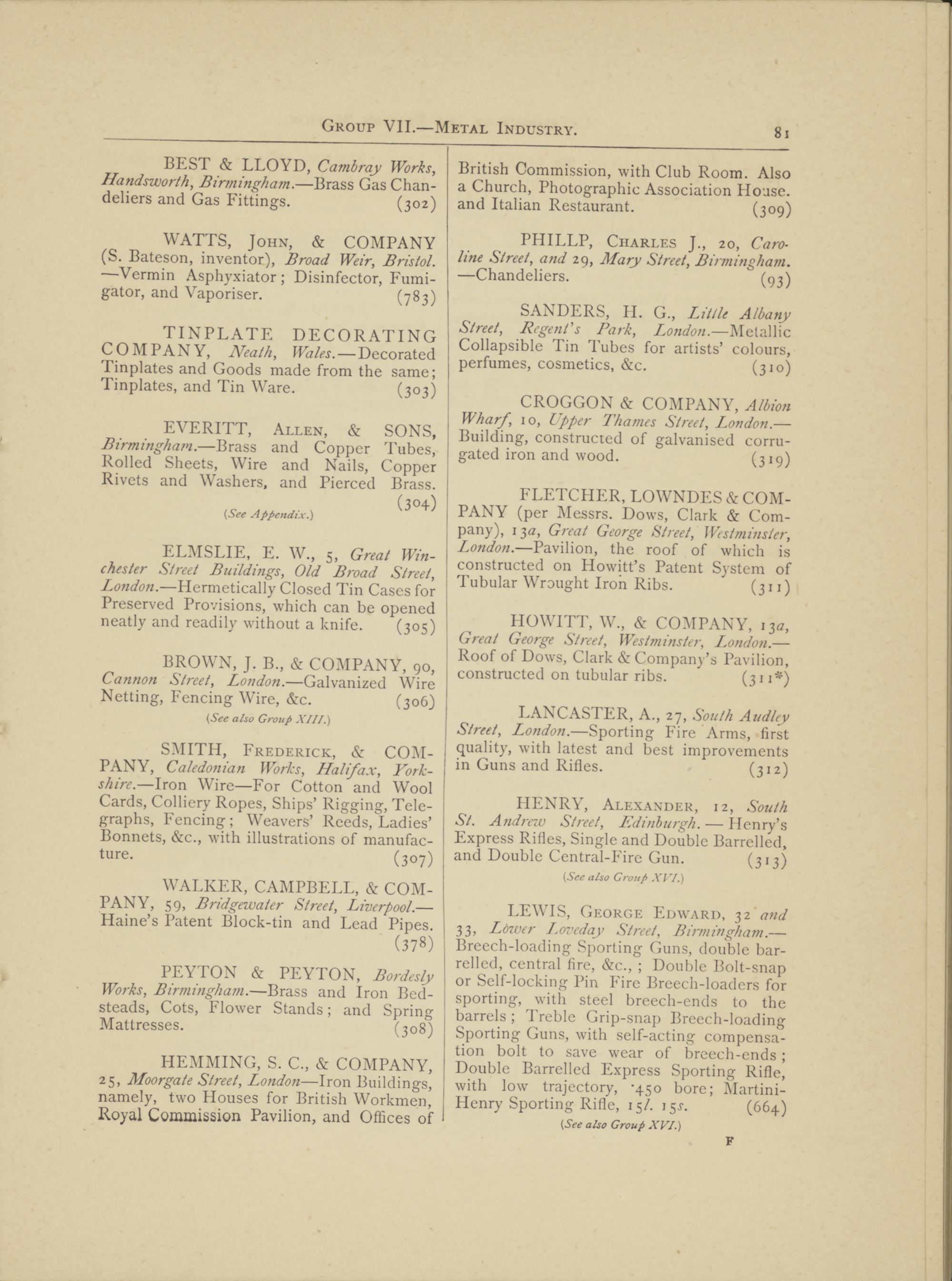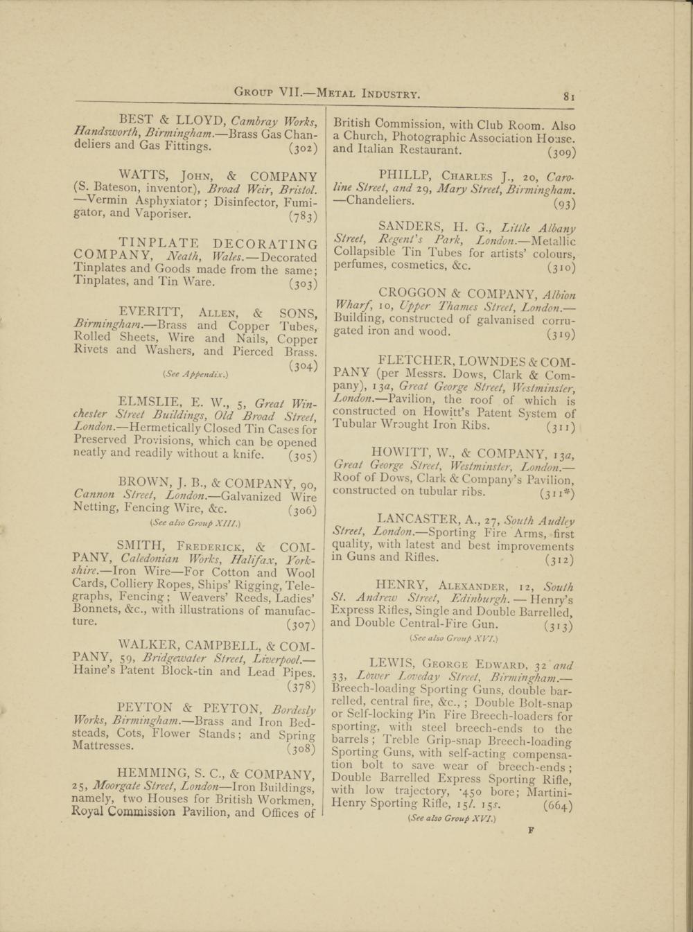 LEWIS, George Edward, 32 and 33, Ldwer I.ovcday Street, Birmingham .— Breech-loading Sporting Guns, double barrelled, central fire, &c., ; Double Bolt-snap or Self-locking Pin Fire Breech-loaders for sporting, with steel breech-ends to the barrels ; Treble Grip-snap Breech-loading Sporting Guns, with self-acting compensation bolt to save wear of breech-ends; Double Barrelled Express Sporting Rifle, with low trajectory, *450 bore; Martini- Henry Sporting Rifle, 15/. 15^. (664)