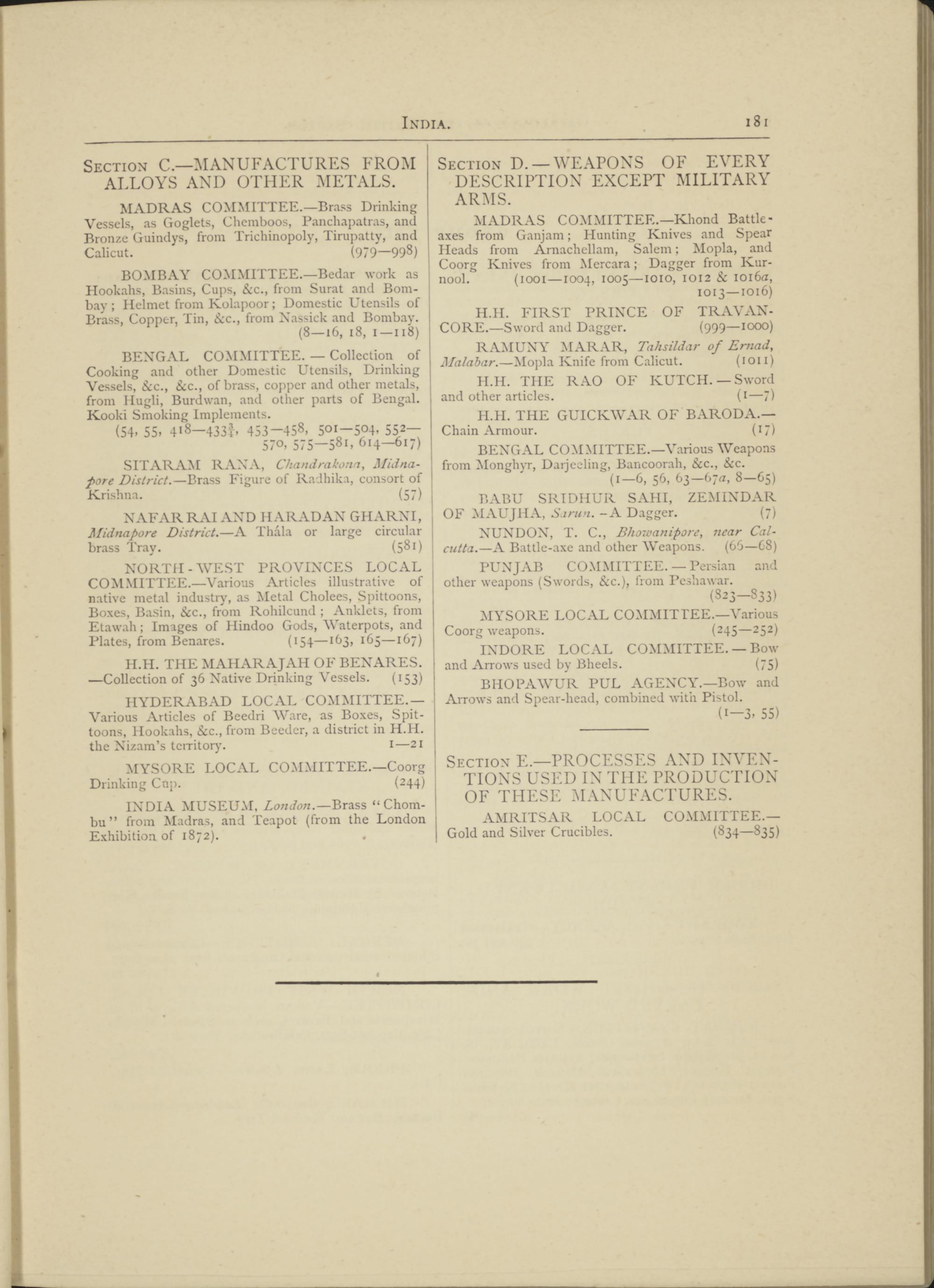 BOMBAY COMMITTEE.—Bedar work as Hookahs, Basins, Cups, &c., from Surat and Bombay ; Helmet from Kolapoor; Domestic Utensils of Brass, Copper, Tin, &c., from Nassick and Bombay.