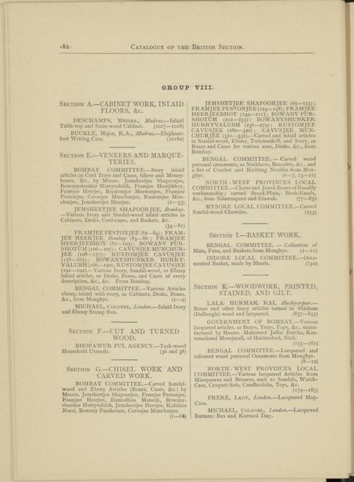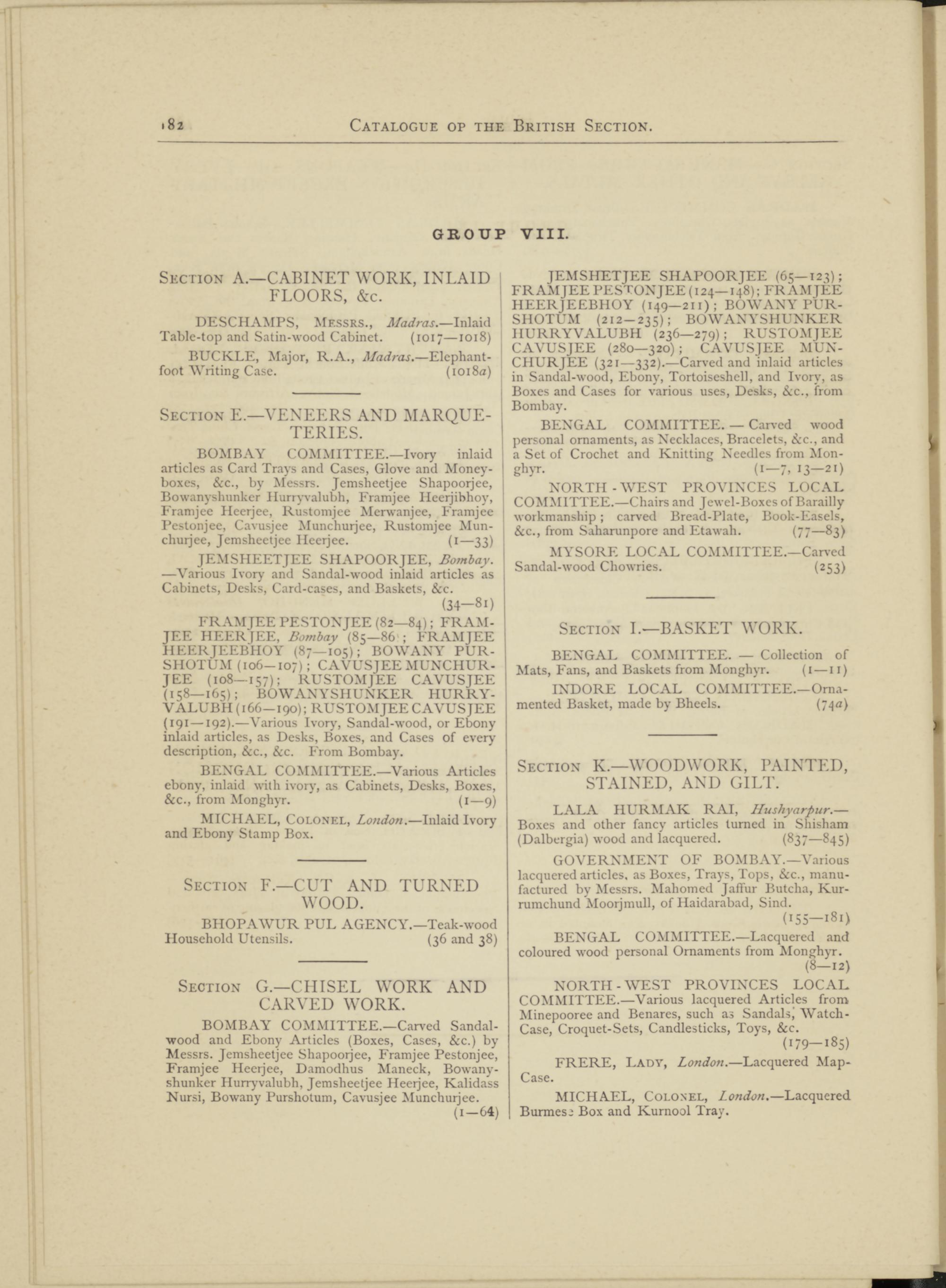 I FRAMJEE PESTONJEE (124—148); FRAMJEE I HEERJEEBHOY (149—211); BOWANY PUR- j SHOTUM (212-235); BOWANYSHUNKER I HURRYVALUBH (236—279); RUSTOMJEE | CAVUSJEE (280—320); CAVUSJEE MUX- I CHURJEE (321—332).—Carved and inlaid articles ! in Sandal-wood, Ebony, Tortoiseshell, and Ivory, as 1 Boxes and Cases for various uses, Desks, &c., from ! Bombay.