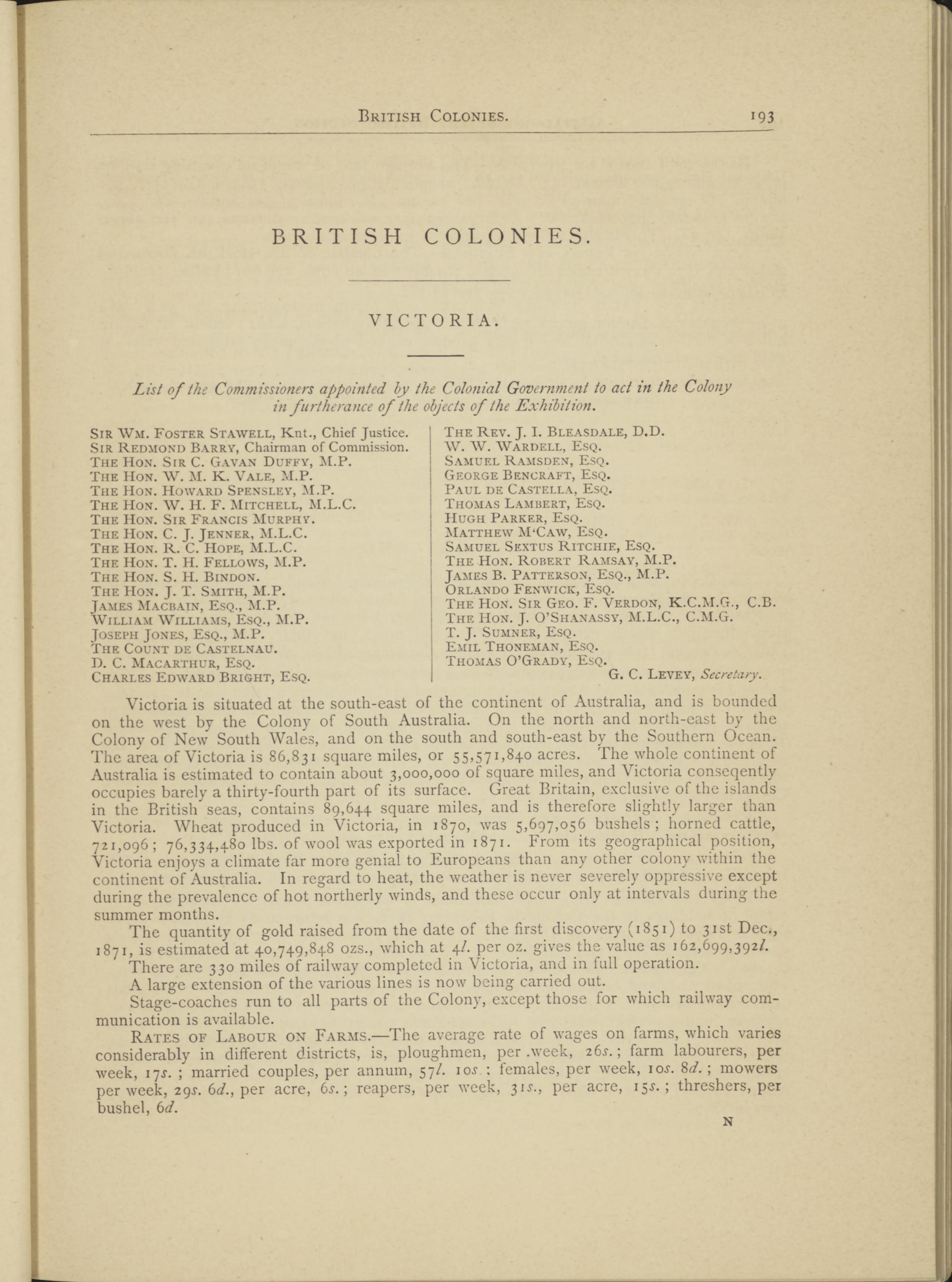Victoria is situated at the south-east of the continent of Australia, and is bounded on the west by the Colony of South Australia. On the north and north-east by the Colony of New South Wales, and on the south and south-east by the Southern Ocean. The area of Victoria is 86,831 square miles, or 55,571,840 acres. The whole continent of Australia is estimated to contain about 3,000,000 of square miles, and Victoria conseqently occupies barely a thirty-fourth part of its surface. Great Britain, exclusive of the islands in the British seas, contains 89,644 square miles, and is therefore slightly larger than Victoria. Wheat produced in Victoria, in 1870, was 5,697,056 bushels; horned cattle, 721,096; 76,334,480 lbs. of wool was exported in 1871. From its geographical position, Victoria enjoys a climate far more genial to Europeans than any other colony within the continent of Australia. In regard to heat, the weather is never severely oppressive except during the prevalence of hot northerly winds, and these occur only at intervals during the summer months.