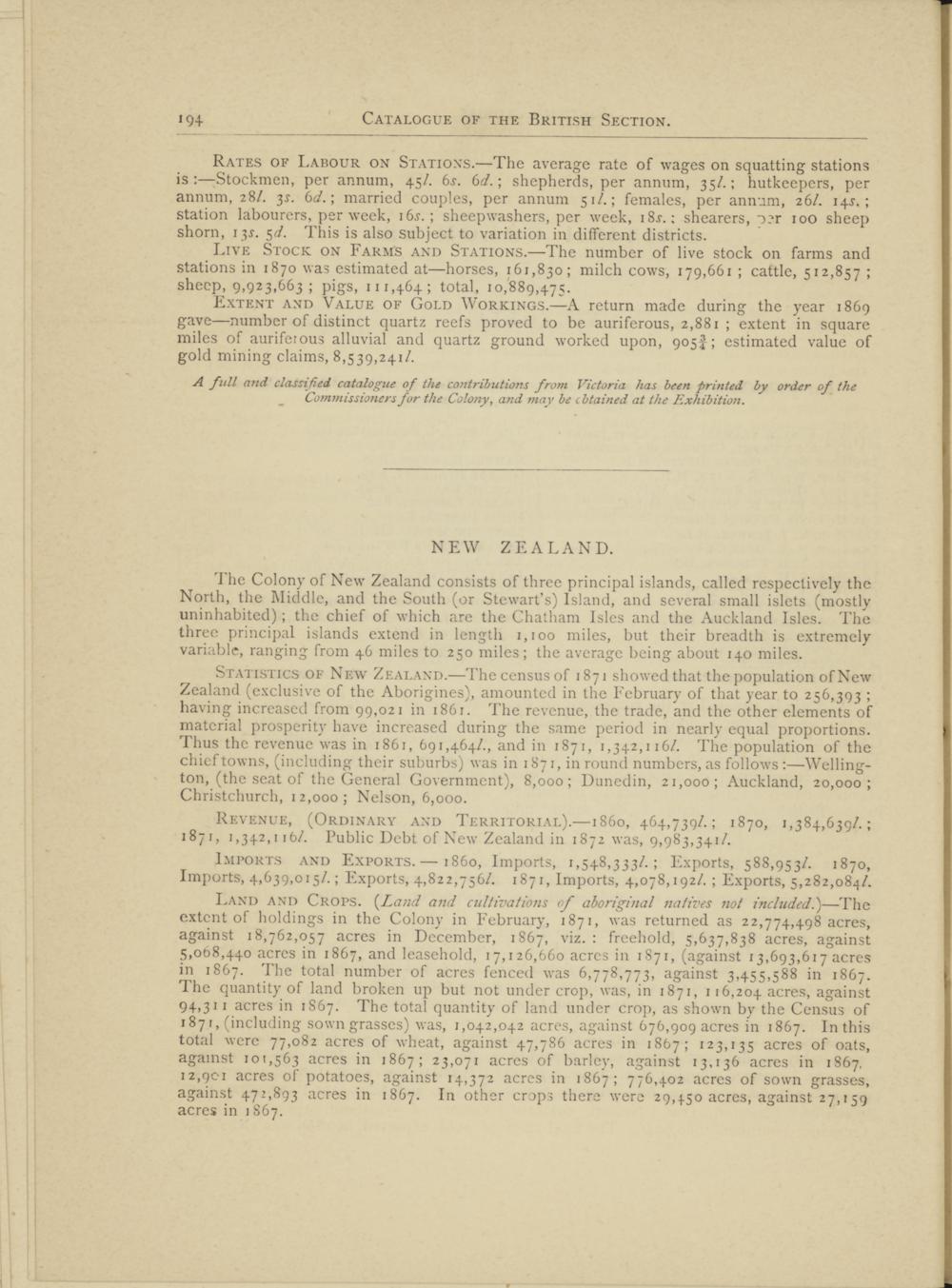 Statistics of New Zealand. —The census of 1871 showed that the population of New Zealand (exclusive of the Aborigines), amounted in the February of that year to 256,393 ; having increased from 99,021 in 1861. The revenue, the trade, and the other elements of material prosperity have increased during the same period in nearly equal proportions. Thus the revenue was in 1861, 691,464/., and in 1871, 1,342,116/. The population of the chief towns, (including their suburbs) was in 1871, in round numbers, as follows:—Wellington, (the seat of the General Government), 8,000; Dunedin, 21,000; Auckland, 20,000; Christchurch, 12,000; Nelson, 6,000.