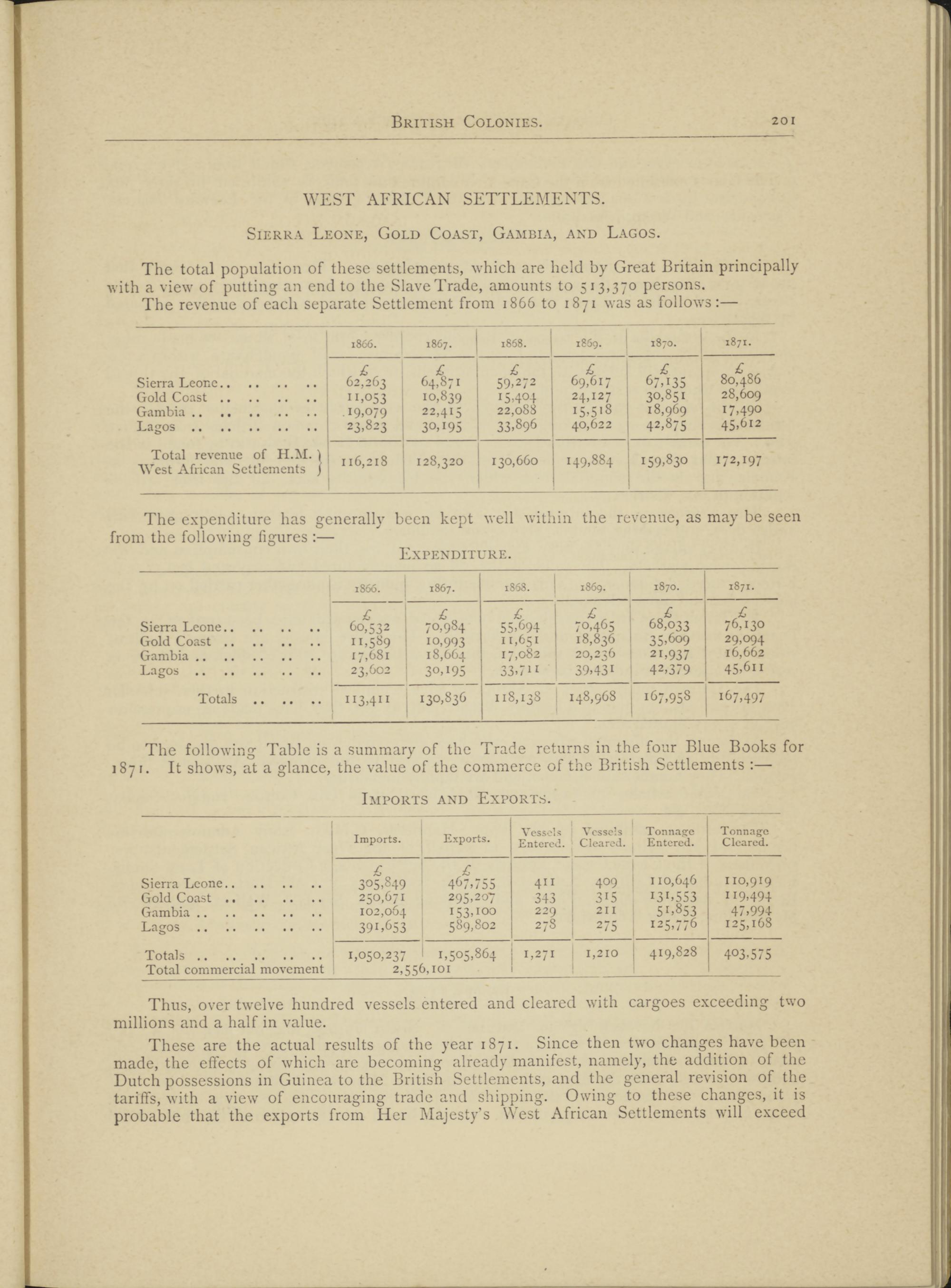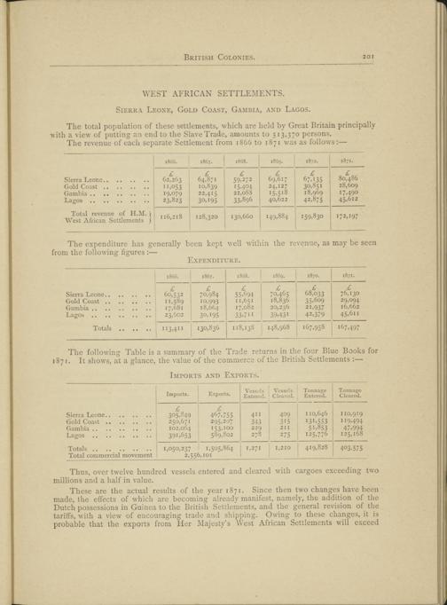 These are the actual results of the year 1871. Since then two changes have been made, the effects of which arc becoming already manifest, namely, the addition of the Dutch possessions in Guinea to the British Settlements, and the general revision of the tariffs, with a view of encouraging trade and shipping. Owing to these changes, it is probable that the exports from Her Majesty’s West African Settlements will exceed