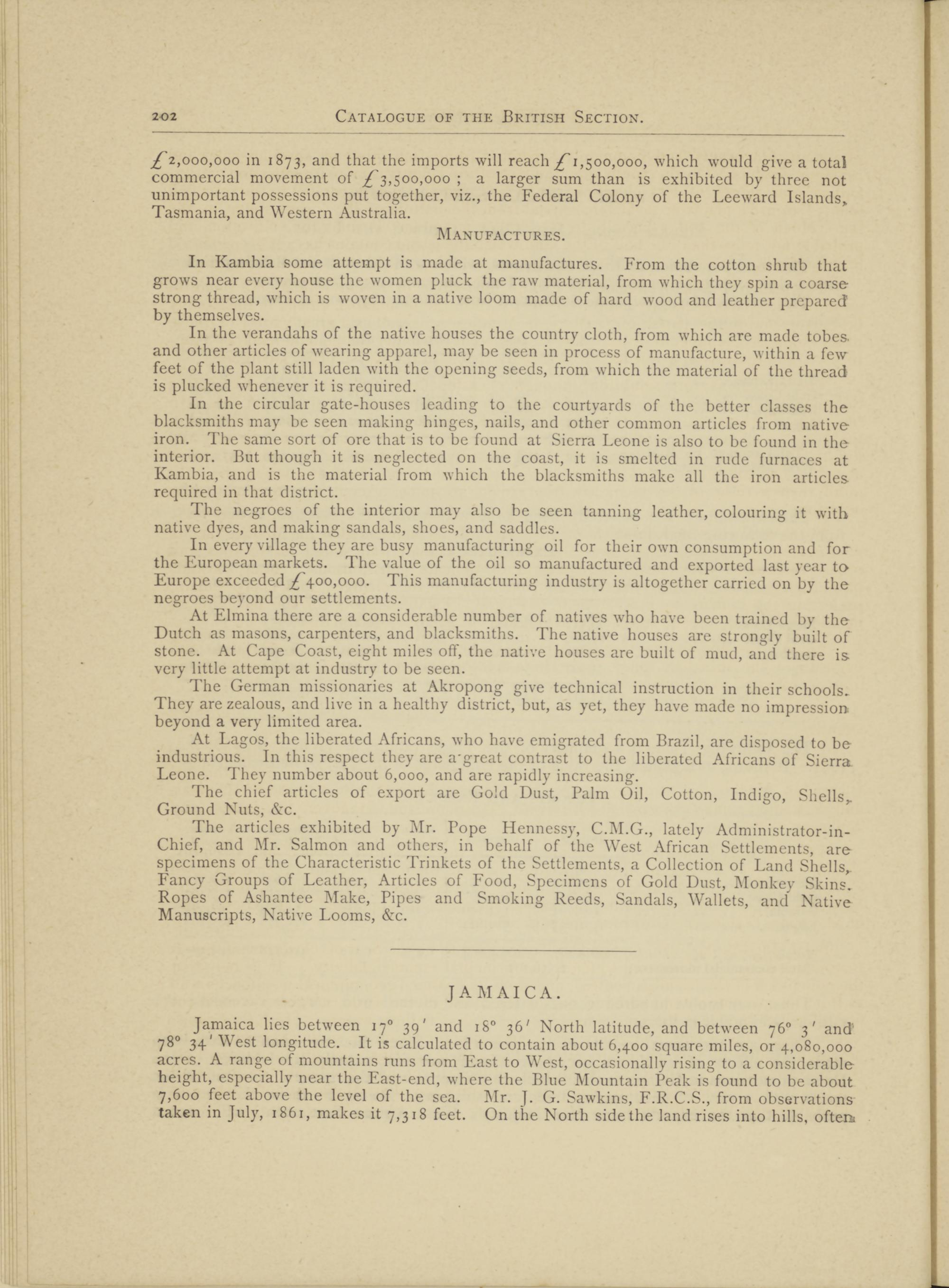 The articles exhibited by Mr. Pope Hennessy, C.M.G., lately Administrator-in- Chief, and Mr. Salmon and others, in behalf of the West African Settlements, are specimens of the Characteristic Trinkets of the Settlements, a Collection of Land Shells,. Fancy Groups of Leather, Articles of Food, Specimens of Gold Dust, Monkey Skins. Ropes of Ashantee Make, Pipes and Smoking Reeds, Sandals, Wallets, and Native Manuscripts, Native Looms, &c.