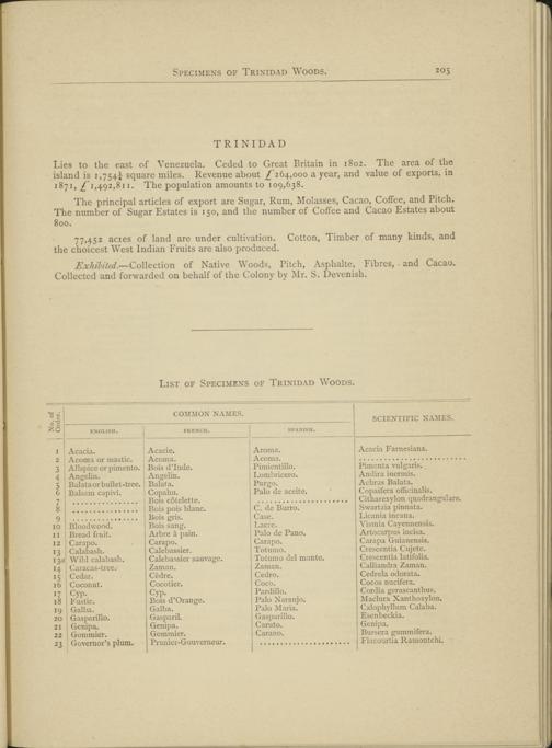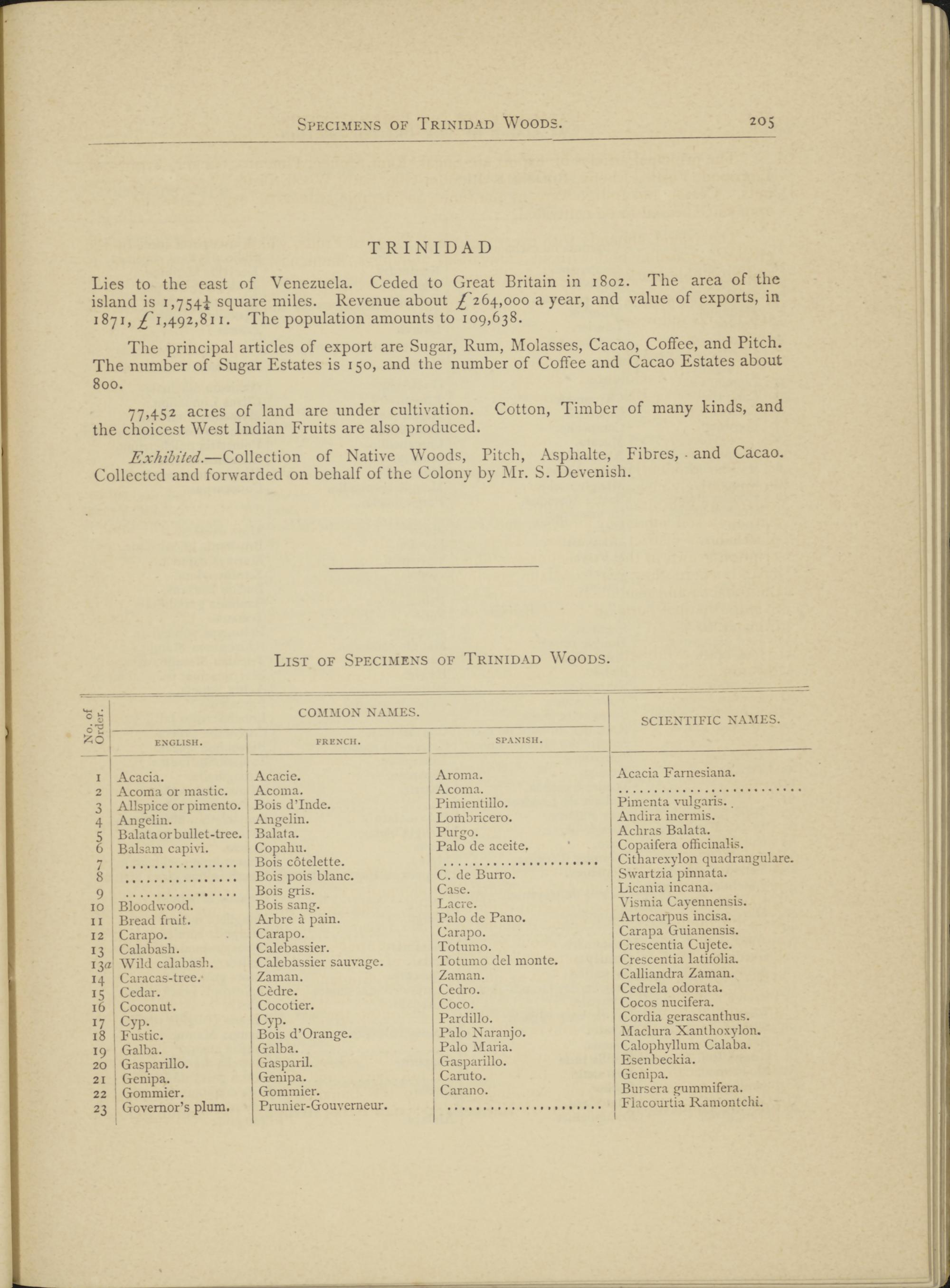 Exhibited .—Collection of Native Woods, Pitch, Asphalte, Fibres, • and Cacao. Collected and forwarded on behalf of the Colony by Mr. S. Devenish.