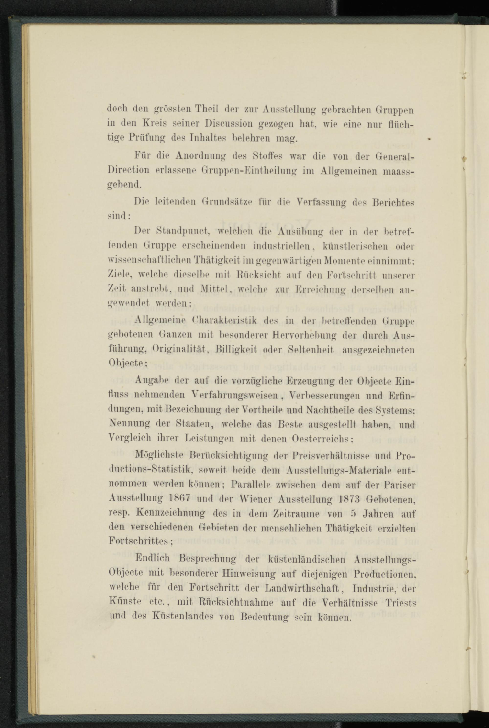 Der Standpuiiet, welchen die Ausübung der in der betreffenden Gruppe erscheinenden industriellen, künstlerischen oder wissenschaftlichen Thätigkeit im gegenwärtigen Momente einnimmt: Ziele, welche dieselbe mit Rücksicht auf den Fortschritt unserer Zeit anstrebt, und Mittel, welche zur Erreichung derselben angewendet werden: