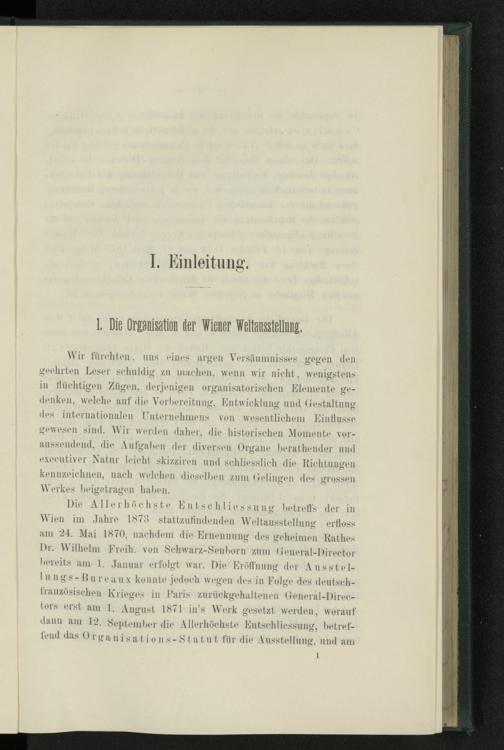 Die Allerhöchste E n tsc hlie s sung betreifs der in Wien im Jahre 1873 stattzutindenden Weltausstellung ertioss am 24. Mai 1870, nachdem die Ernennung des geheimen Käthes I)r. Wilhelm Freili. von Schwarz-Senborn zum Ueneral-Director bereits am 1. Januar erfolgt war. Die Eröffnung der Ausstel- 1 u ngs-liui'eaux konnte jedoch wegen des in Folge des deutschfranzösischen Krieges in l'aris zurückgehaltenen General-Diree- tors erst am 1. August 1871 in’s Werk gesetzt werden, worauf dann am 12. September die Allerhöchste Entschliessung, betreffend das 0 r g a n i s a t i o n s - S t a t u t für die Ausstelhmg, und am