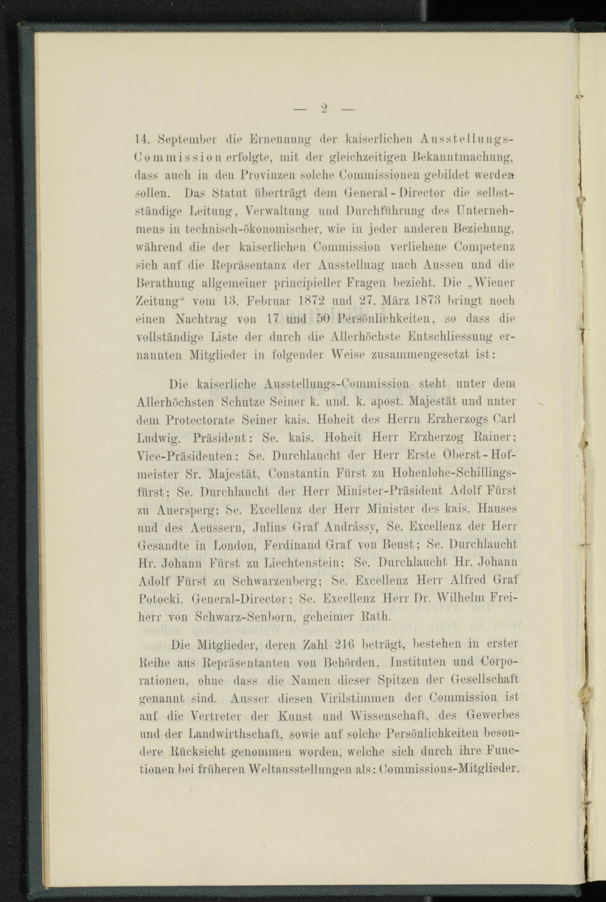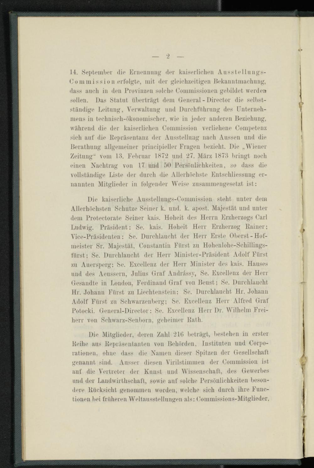 während die der kaiserlichen Commission verliehene Competenz sich auf di«* Repräsentanz der Ausstellung nach Aussen und »lie Berathung allgemeiner principieller Fragen bezieht. Die „Wiener Zeitung -4 vom IS. Februar 1872 und 27. März 1878 bringt noch einen Nachtrag von 17 und hO Persönlichkeiten, so »lass die vollständige Liste der durch die Allerhöchste Fntschliessung er-