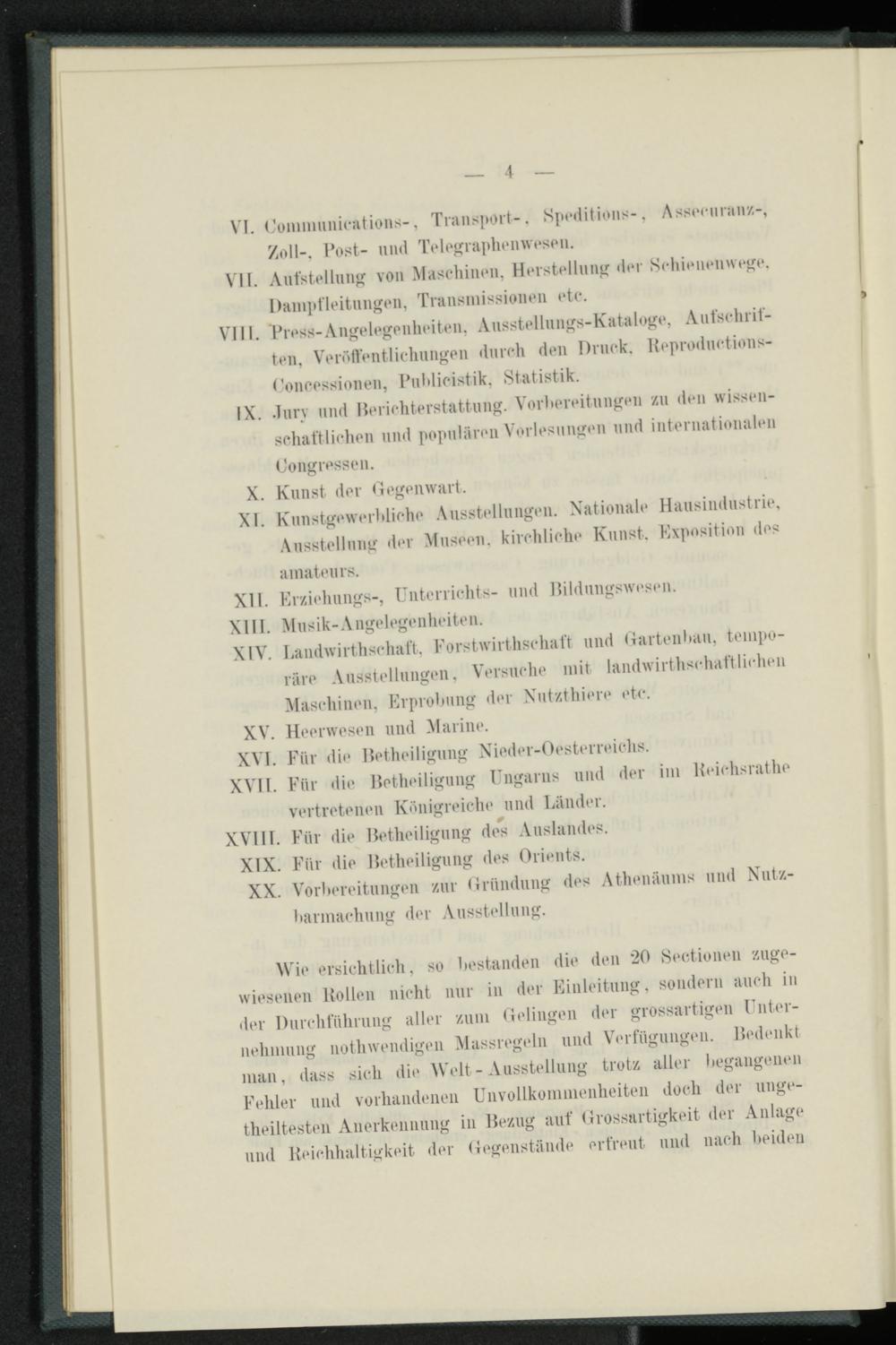 Wie ersichtlich, so bestanden die den 20 Beotionen zugewiesenen Bollen nicht nur in der Einleitung, sondern auch in der Durchführung aller zum Gelingen der grossartigen Unternehmung nothwendigen Massregeln und Verfügungen. Bedenkt man, dass sich die Welt - Ausstellung trotz aller begangenen Fehler und vorhandenen Unvollkommenheiten doch der unge- theiltesten Anerkennung in Bezug auf Grossartigkeit der Anlage und Reichhaltigkeit der Gegenstände erfreut und nach beiden