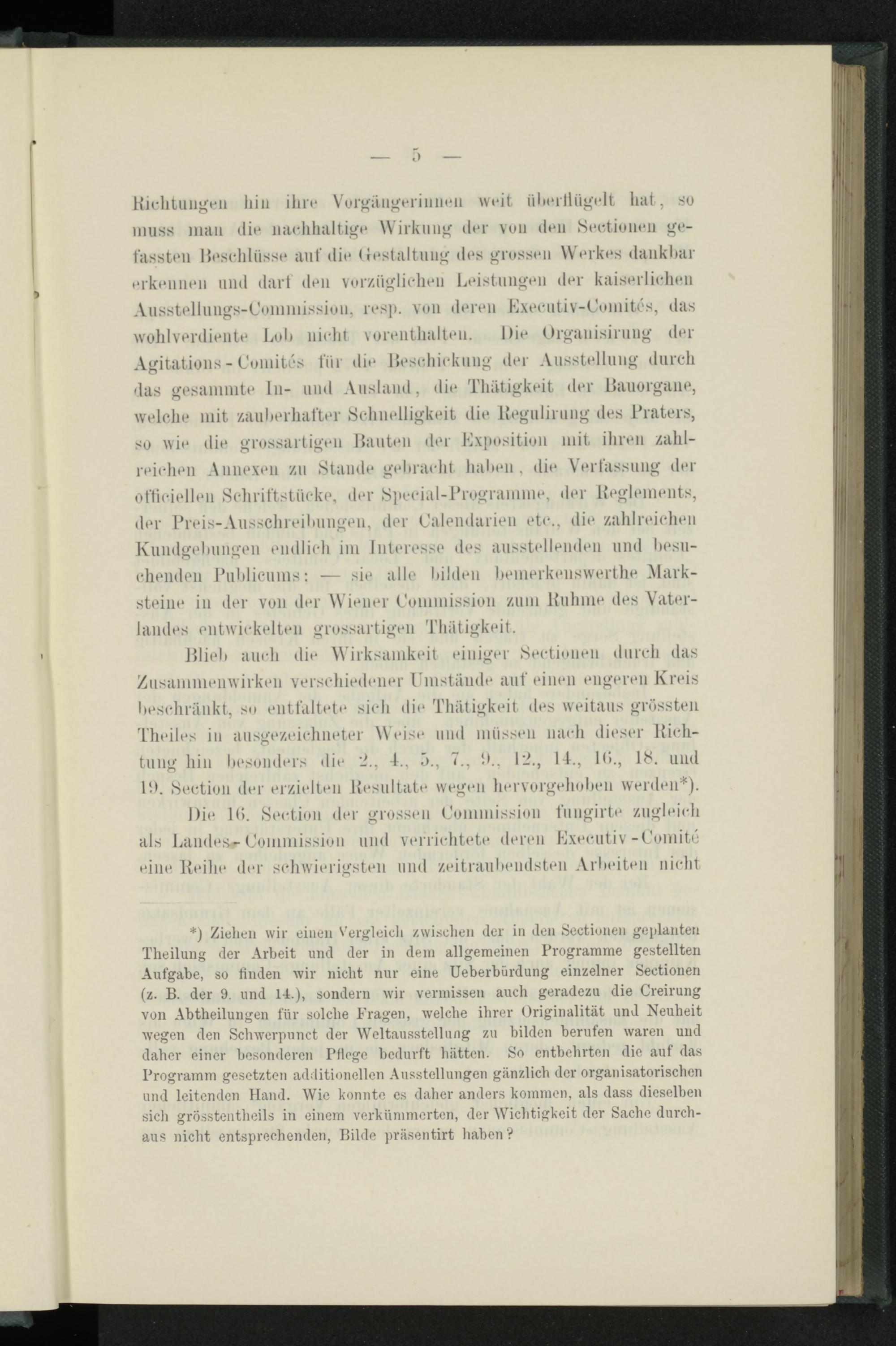 Richtungen hin ihn* Vorgängerinnen weit ühoillügolt luit, hu muss mau die nachhaltige Wirkung der von den Sectionen gefassten Beschlüsse auf die Gestaltung des grossen Werkes dankbar erkennen und darf den vorzüglichen Leistungen der kaiserlichen Ausstellungs-Commission, resp. von deren Kxecutiv-Comites, das wohlverdient«* Loh nicht \orenthalten. Die Organisirung der Agitations - Comitcs für die Beschickung der Ausstellung durch das gesammte In- und Ausland, die Thütigkeit der Bauorgane, welche mit zauberhafter Schnelligkeit die Ilegulirung «les Braters, so wie die grossartigen Bauten der Exposition mit ihren zahlreichen Annexen zu Stande gebracht haben, di«* Verfassung der ofticiellen Schriftstücke, der Special-Programme, «l«*r R«‘glements, der Preis-Ausschreibungen, «lor Calendarien etc., tli«* zahlr«*ichen Kundgebungen emllich im Int«*ress(* «les ausstellenden und besuchenden Bublicums: — sie alle bilden bemerkenswerthe Marksteine in der von der Wiener Commission zum Ruhme «les Vaterlandes entwickelten grossartigen Thütigkeit.