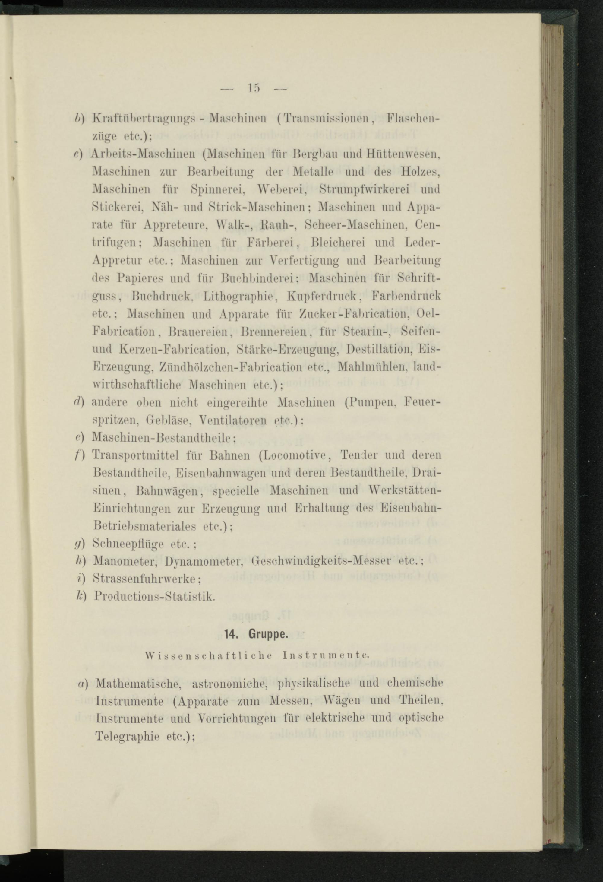 Fabrication, Brauereien, Brennereien, für Stearin-, Seifen- und Kerzen-Fabrication, Stärke-Erzeugung, Destillation, Eis- Erzeugung, Zündhölzehen-Fabrication etc., Mahlmühlen, landwirtschaftliche Maschinen etc.); r/) andere oben nicht eingereihte Maschinen (Pumpen, Feuerspritzen, Geldäse, Ventilatoren etc.): e) Maschinen-Bestandtheile: