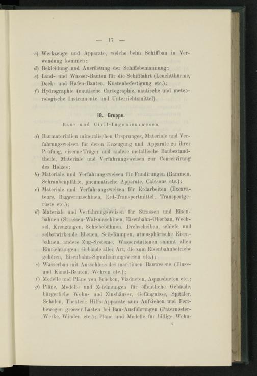 a) Baumaterialien mineralischen Ursprunges, Materiale und Ver- fahrungsweisen für deren Urzeugung und Apparate zu ihrer Prüfung, eiserne Träger und andere metallische Baubestand- theile, Materiale und Verfalmingsweisen zur Gonservirung des Holzes: