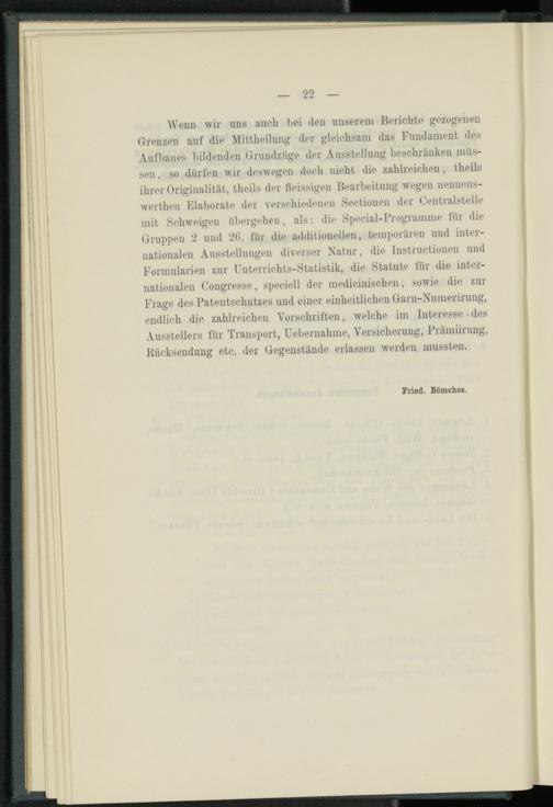 Wenn wir uns auch bei den unserem Berichte gezogenen Grenzen auf die Mittheilung der gleichsam das Fundament des Aufbaues bildenden Grundzüge der Ausstellung beschränken müssen , so dürfen wir deswegen doch nicht die zahlreichen, theils ihrer Originalität, theils der fleissigen Bearbeitung wegen nennens- werthen Elaborate der verschiedenen Sectionen der Centralstelle mit Schweigen übergehen, als: die Special-Programme für die Gruppen 2 und 20, für die additionellen, temporären und internationalen Ausstellungen diverser Natur, die Instructionen und Formularien zur Unterrichts-Statistik, die Statute für die internationalen Congresse, speciell der medicinischen, sowie die. zur Frage des Patentschutzes und einer einheitlichen Garn-Numerirung, endlich die zahlreichen Vorschriften, welche im Interesse-des Ausstellers für Transport, Uebernahme, Versicherung, Prämiirmig, Rücksendung etc. der Gegenstände erlassen werden mussten.