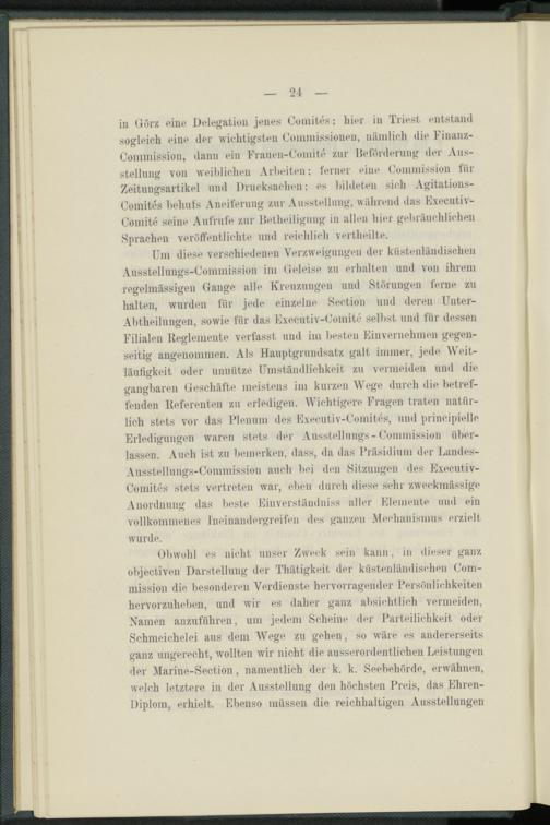 Obwohl es nicht unser Zweck sein kann, in dieser ganz objectiven Darstellung der Thätigkeit der küstenländischen Commission die besonderen Verdienste hervorragender Persönlichkeiten hervorzuheben, und wir es daher ganz absichtlich vermeiden, Namen anzuführen, um jedem Scheine der Parteilichkeit oder Schmeichelei aus dein Wege zu gehen, so wäre es andererseits ganz ungerecht, wollten wir nicht die ausserordentlichen Leistungen der Marine-Section, namentlich der k. k. Seebehörde, erwähnen, welch letztere in der Ausstellung den höchsten Preis, das Ehren- Diplom, erhielt. Ebenso müssen die reichhaltigen Ausstellungen