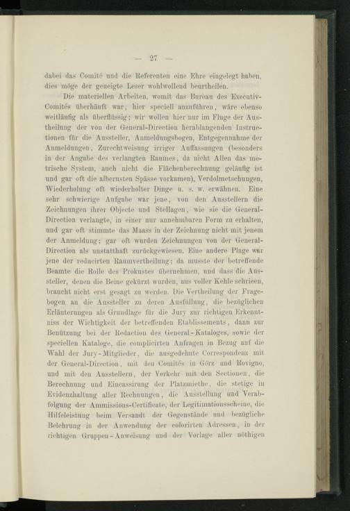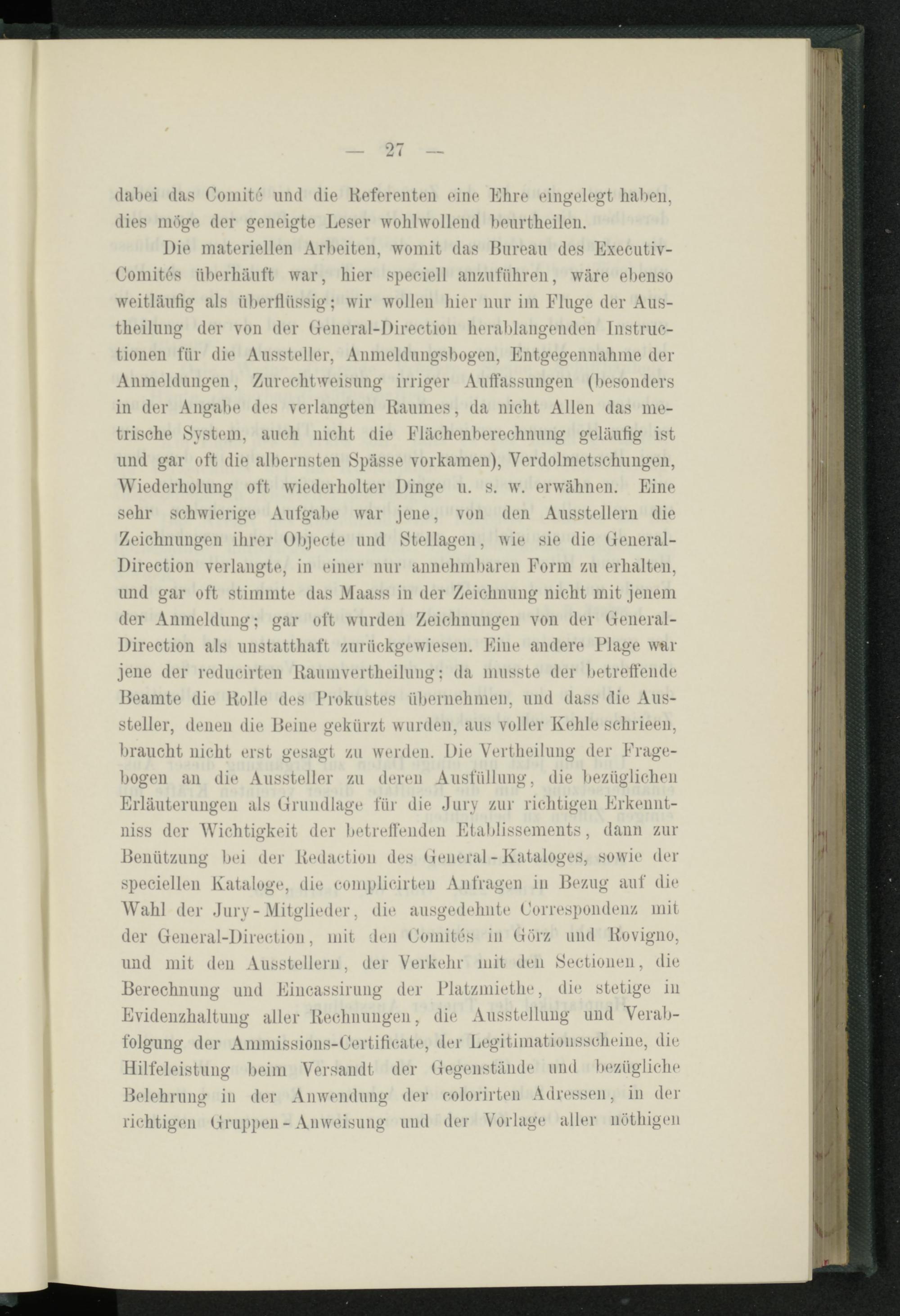 Die materiellen Arbeiten, womit das Bureau des Executiv- Comitös überhäuft war, hier speziell anzuführen, wäre ebenso weitläufig als überflüssig; wir wollen hier nur im Fluge der Aus- theilung der von der General-Direction herablangenden Instructionen für die Aussteller, Anmeldungsbogen, Entgegennahme der Anmeldungen, Zurechtweisung irriger Auffassungen (besonders in der Angabe des verlangten Raumes, da nicht Allen das metrische System, auch nicht die Flächenberechnung geläufig ist und gar oft die albernsten Spässe vorkamen), Verdolmetschungen, Wiederholung oft wiederholter Dinge u. s. w. erwähnen. Eine sehr schwierige Aufgabe war jene, von den Ausstellern die Zeichnungen ihrer Objecte und Stellagen, wie sie die General- Direction verlangte, in einer nur annehmbaren Form zu erhalten, und gar oft stimmte das Maass in der Zeichnung nicht mit jenem der Anmeldung; gar oft wurden Zeichnungen von der General- Direction als unstatthaft zurückgewiesen. Eine andere Plage war jene der reducirten Raumvertheilung: da musste der betreffende Beamte die Rolle des Prokustes übernehmen, und dass die Aussteller, denen die Beine gekürzt wurden, aus voller Kehle schrieen, braucht nicht erst gesagt zu werden. Die Vertheilung der Fragebogen an die Aussteller zu deren Ausfüllung, die bezüglichen Erläuterungen als Grundlage für die .Jury zur richtigen Erkenntnis der Wichtigkeit der betreffenden Etablissements, dann zur Benützung bei der Redaction des General - Kataloges, sowie der speciellen Kataloge, die complicirten Anfragen in Bezug auf die Wahl der Jury-Mitglieder, die ausgedehnte Correspondenz mit der General-Direction, mit den Oomites in Görz und Rovigno, und mit den Ausstellern, der Verkehr mit den Sectionen, die Berechnung und Eincassirung der Platzmiethe, die stetige in Evidenzhaltung aller Rechnungen, die Ausstellung und Verabfolgung der Ammissions-Oertificate, der Legitimationsscheine, die Hilfeleistung beim Versandt der Gegenstände und bezügliche Belehrung in der Anwendung der colorirten Adressen, in der richtigen Gruppen - Anweisung und der Vorlage aller nöthigen