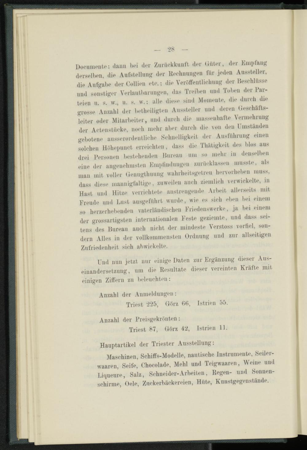 Documente: dann hei der Zurückkunft der (Jäter, der Empfang derselben, die Aufstellung der "Rechnungen für jeden Aussteller, die Aufgabe der Collien etc.: die Veröffentlichung der Beschlüsse und sonstiger Verlautbarungen, das Treiben und Tuben der Parteien n. s. w., u. s. w.: alle diese sind Momente, die durch die grosse Anzahl der betheiligten Aussteller und deren (Jeschäfts- leiter oder Mitarbeiter, und durch die massenhafte Vermehrung der Actenstiicke, noch mehr alter durch die von den Umständen gebotene ausserordentliche Schnelligkeit der Ausführung einen solchen Höhepunct erreichten, dass die Tlnitigkeit des blos aus drei Personen bestellenden Bureau um so mehr in denselben eine der angenehmsten Fmpliudungen zurücklassen musste, als man mit voller Oenugthuung wahrheitsgetreu hervorheben muss, dass diese mannigfaltige, zuweilen auch ziemlich verwickelte, in Hast und Hitze verrichtete anstrengende Arbeit allerseits mit Freude und Lust ausgeführt wurde, wie es sich eben bei einem so herzerhelienden vaterländischen Friedenswerke, ja bei einem der grossartigsten internationalen Feste geziemte, und dass seitens des "Bureau auch nicht der mindeste Verstoss vorbei, sondern Alles in der vollkommensten Ordnung und zur allseitigen Zufriedenheit sich abwickelte.
