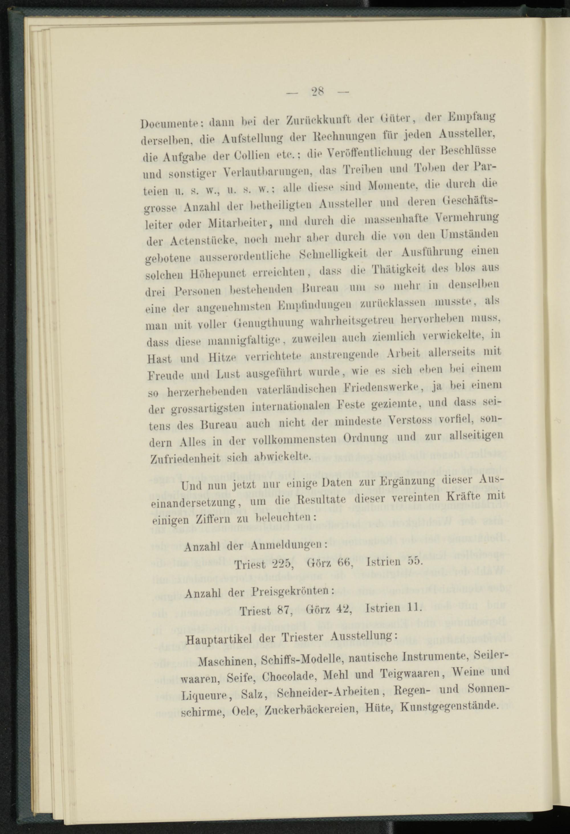 Maschinen, Schiffs-Modelle, nautische Instrumente, Seiler- waaren, Seife, Chocolade, Mehl und Teigwaaren, Weine und Liqueure, Salz, Schneider-Arbeiten, Regen- und Sonnenschirme, Oele, Zuckerbäckereien, Hüte, Kunstgegenstände.
