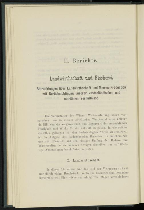 Die" Veranstalter der Wiener Weltausstellung haben versprochen, uns in diesem „friedlichen Wettkampf aller Völker“ ein Bild von der Vergangenheit und (legenwart der menschlichen Thiitigkeit und Winkt' für die Zukunft zu gehen. In wie weit es denselben gelungen ist, den beabsichtigten Zweck zu erreichen, ist die Aufgabt' des nachstehenden Berichtes, in welchem wir uns mit Rücksicht auf den riesigen Umfang der Boden- und Wassercultiir bei so manchen Zweigen derselben nur auf Hrichtige Andeutungen beschränken mussten.