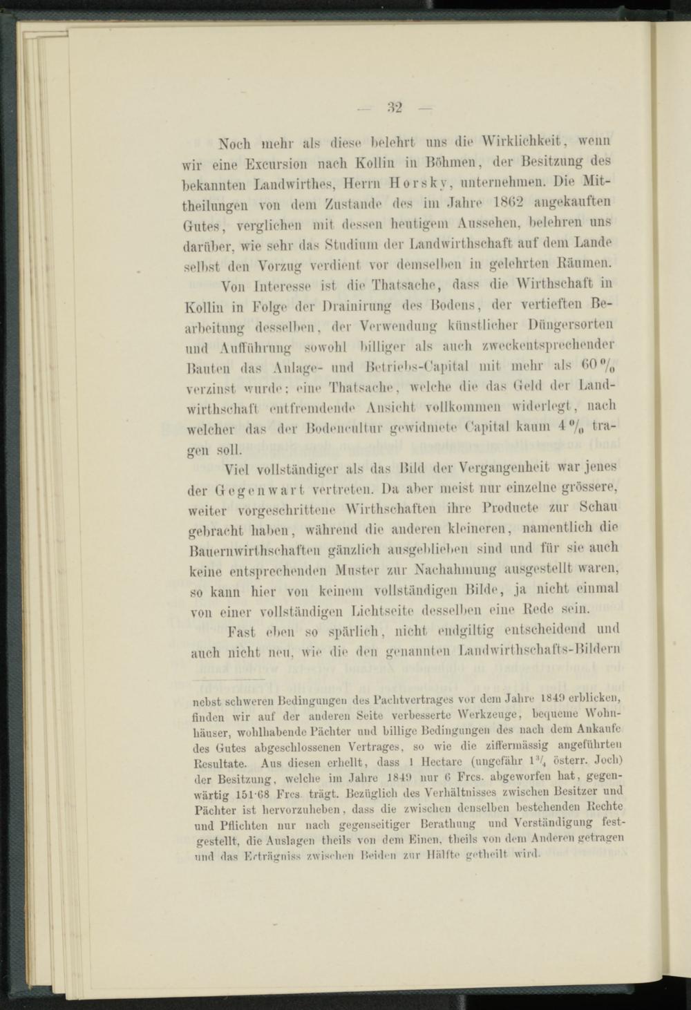 Noch mehr als diese holehrt uns die Wirklichkeit, wenn wir eine Excursion nach Kollin in Böhmen, der Besitzung des bekannten Landwirthes, Herrn Horsky, unternehmen. Die Mittheilungen von dem Zustande des im Jahre 1H()2 angekauften Gutes, verglichen mit dessen heutigem Aussehen, helehren uns darüber, wie sehr das Studium der bandwirthsehaft auf dem Lande selbst den Vorzug verdient vor demselben in gelehrten Bäumen.